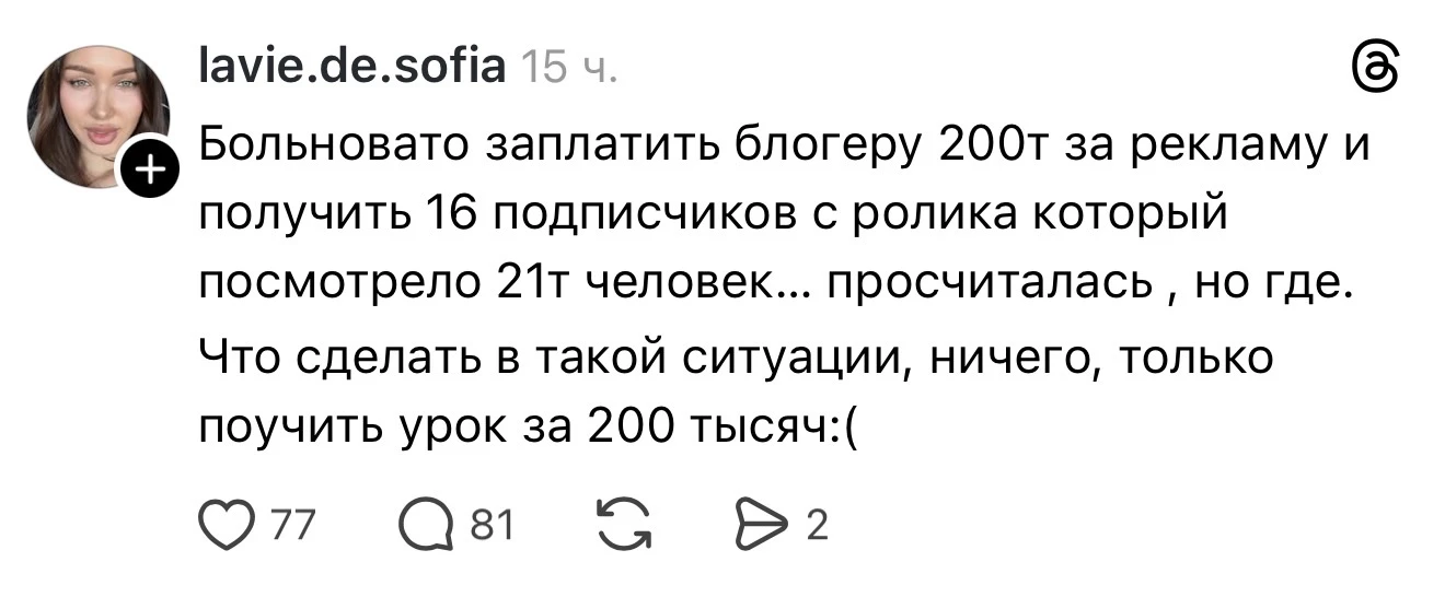 Сейчас нам тоже больно платить авторам в максе овер прайсы за рекламу, получая за 20.000 р 20 человек и на сдачу ответ «ну сейчас все такие цены ставят, а приходов нет, мы не знаем что делать, но это рынок».