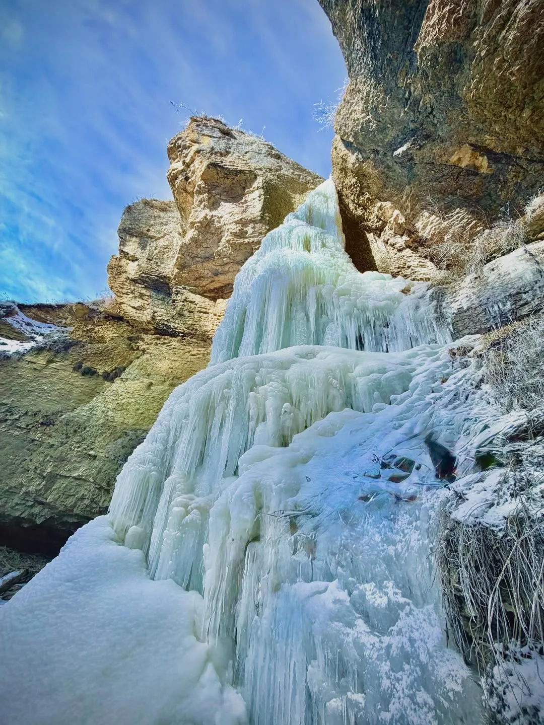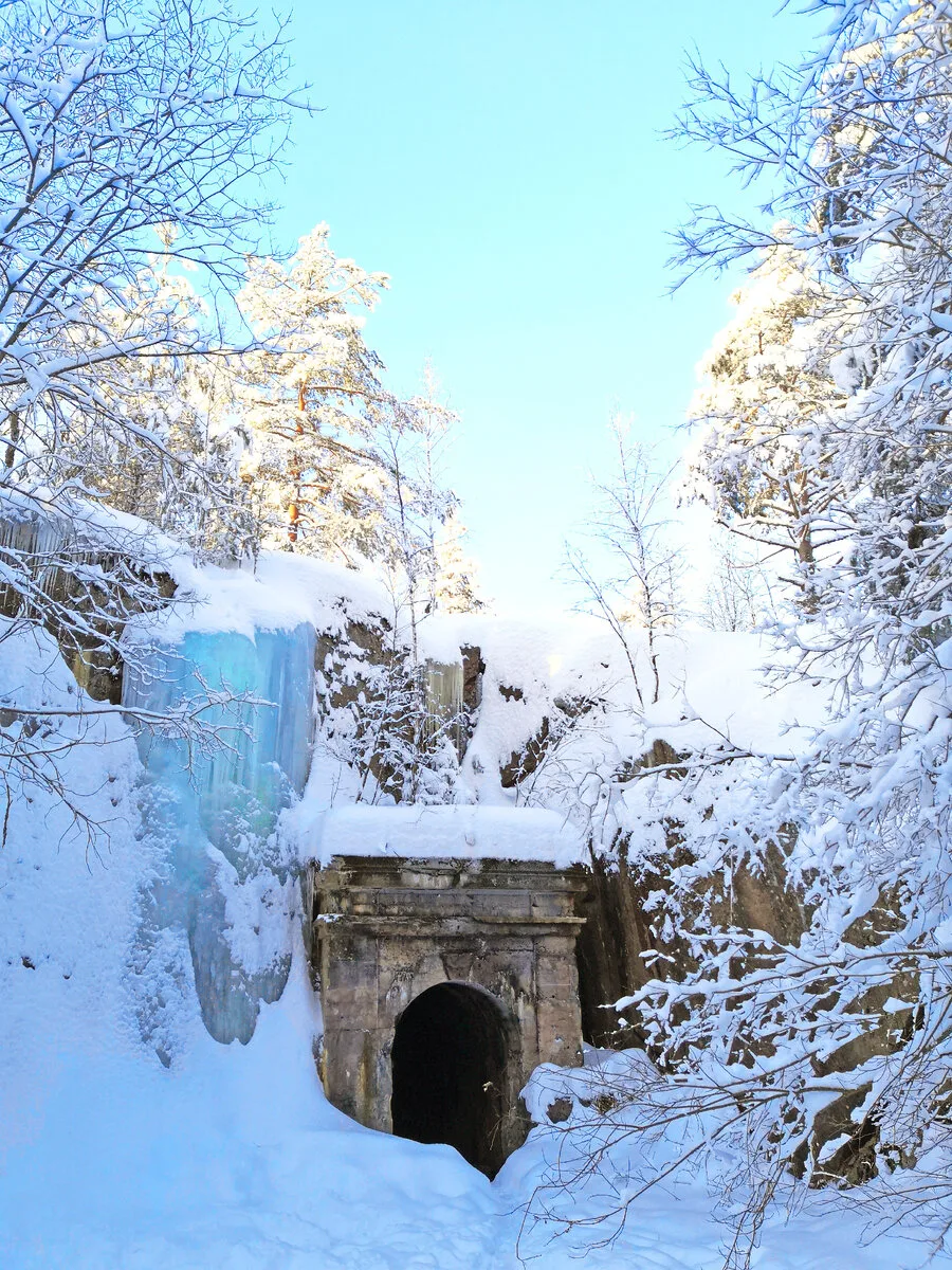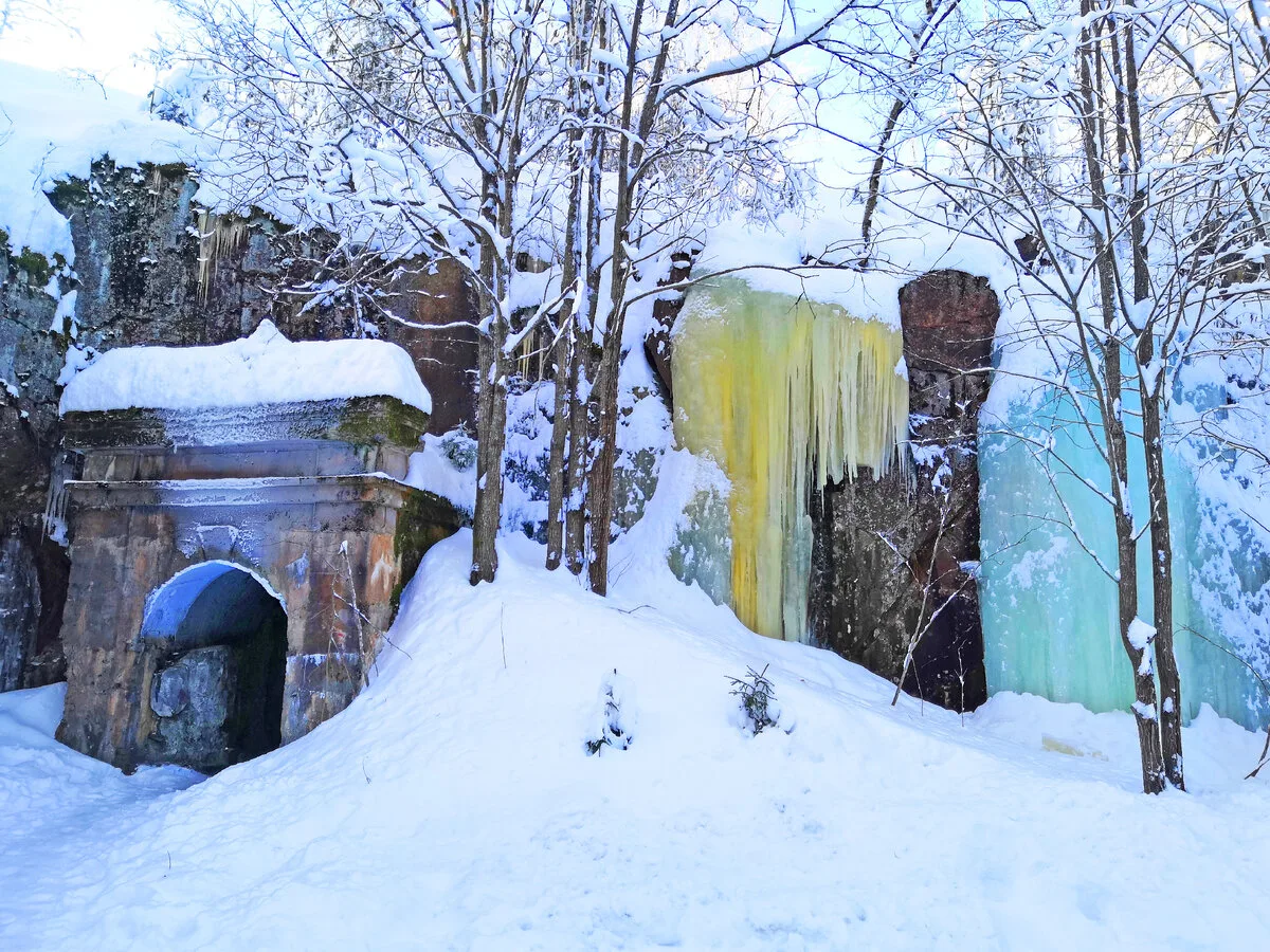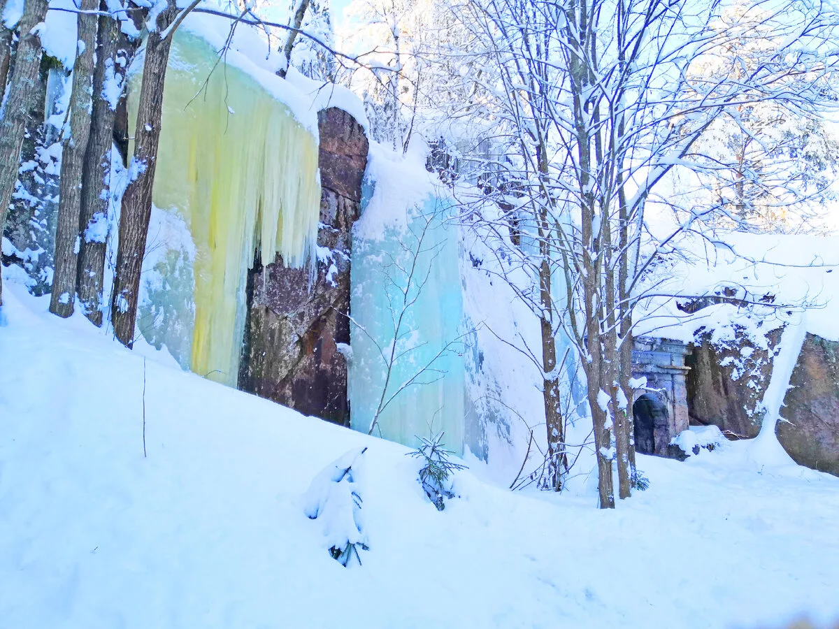 Вода замерзает, превращая каскад в мощный ледопад. Скалы обрастают льдом, струи застывают в причудливых формах.