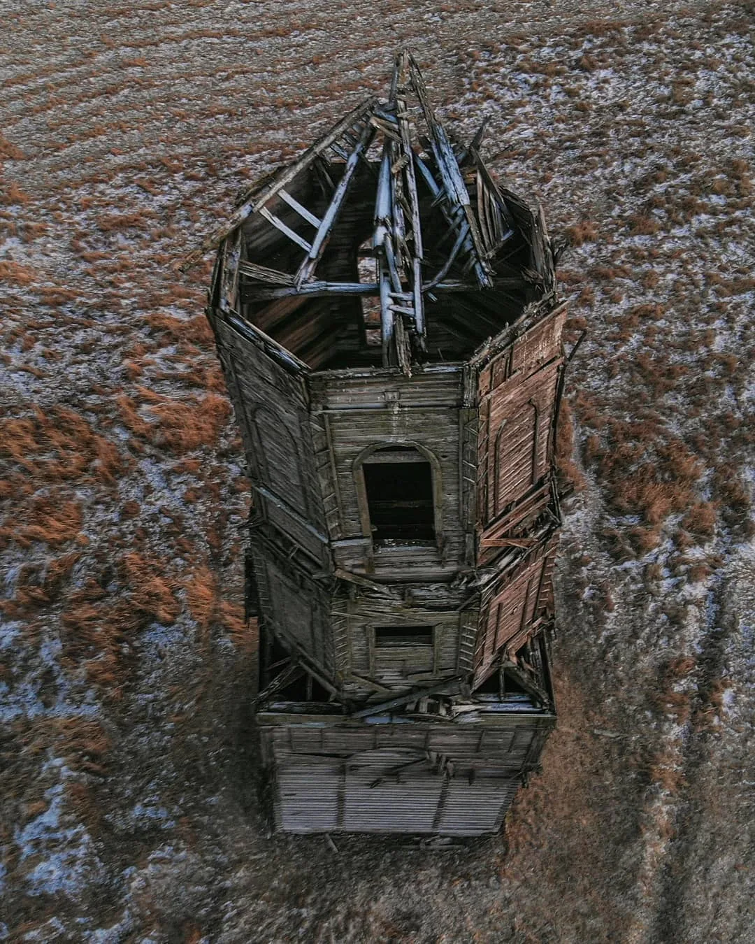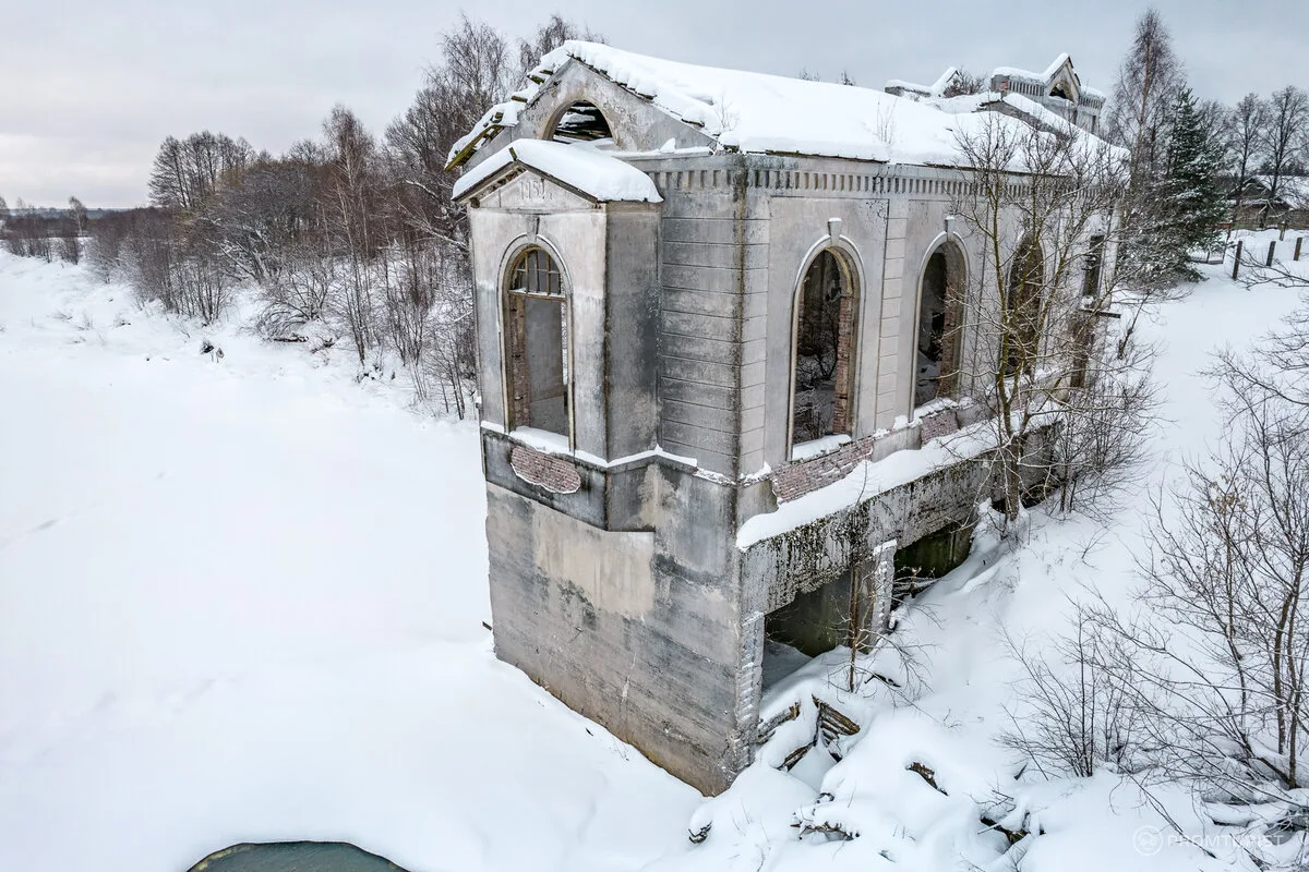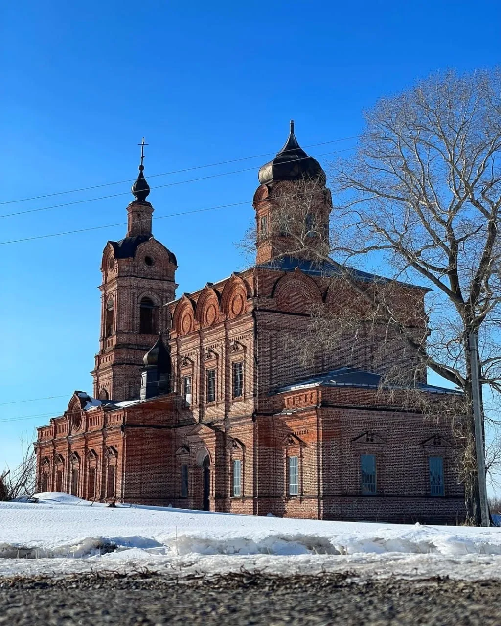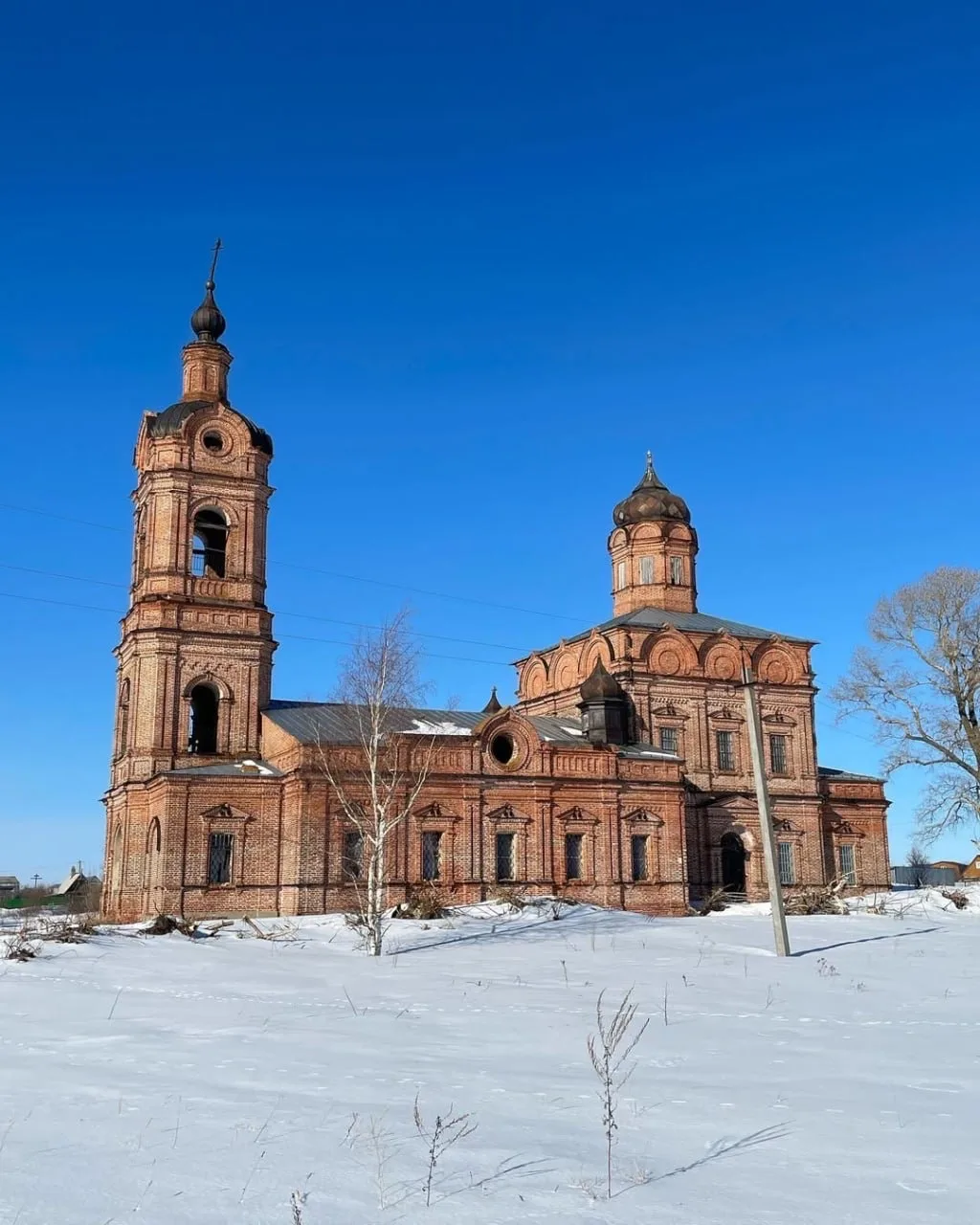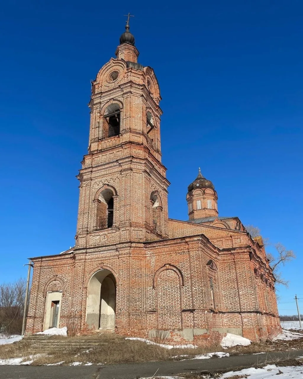 Сегодня от Никольского храма остались развалины. А вот Покровская церковь до сих пор стоит — и зимой её тёмный силуэт резко контрастирует с белым снегом.