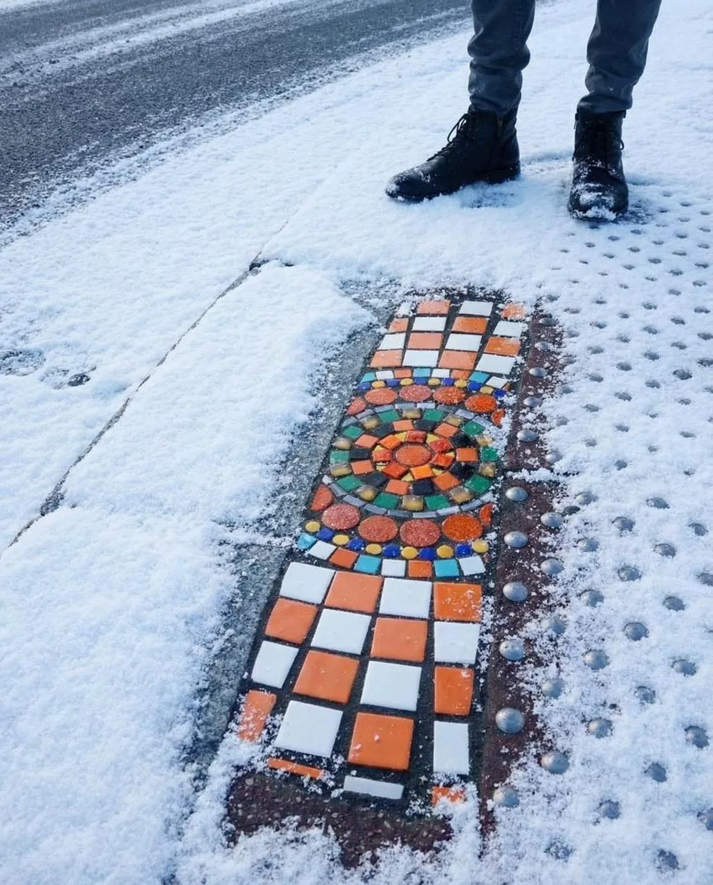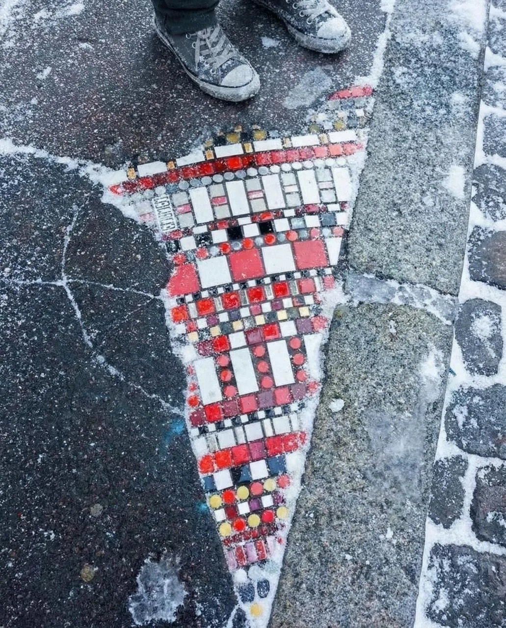 Вместо того чтобы мириться с разбитым асфальтом, он превращает его в арт-объекты. Цветные узоры аккуратно вписываются в форму ям, будто так было задумано изначально.