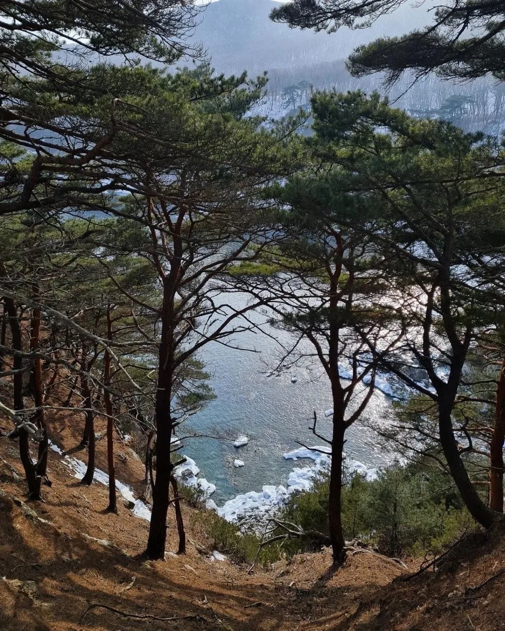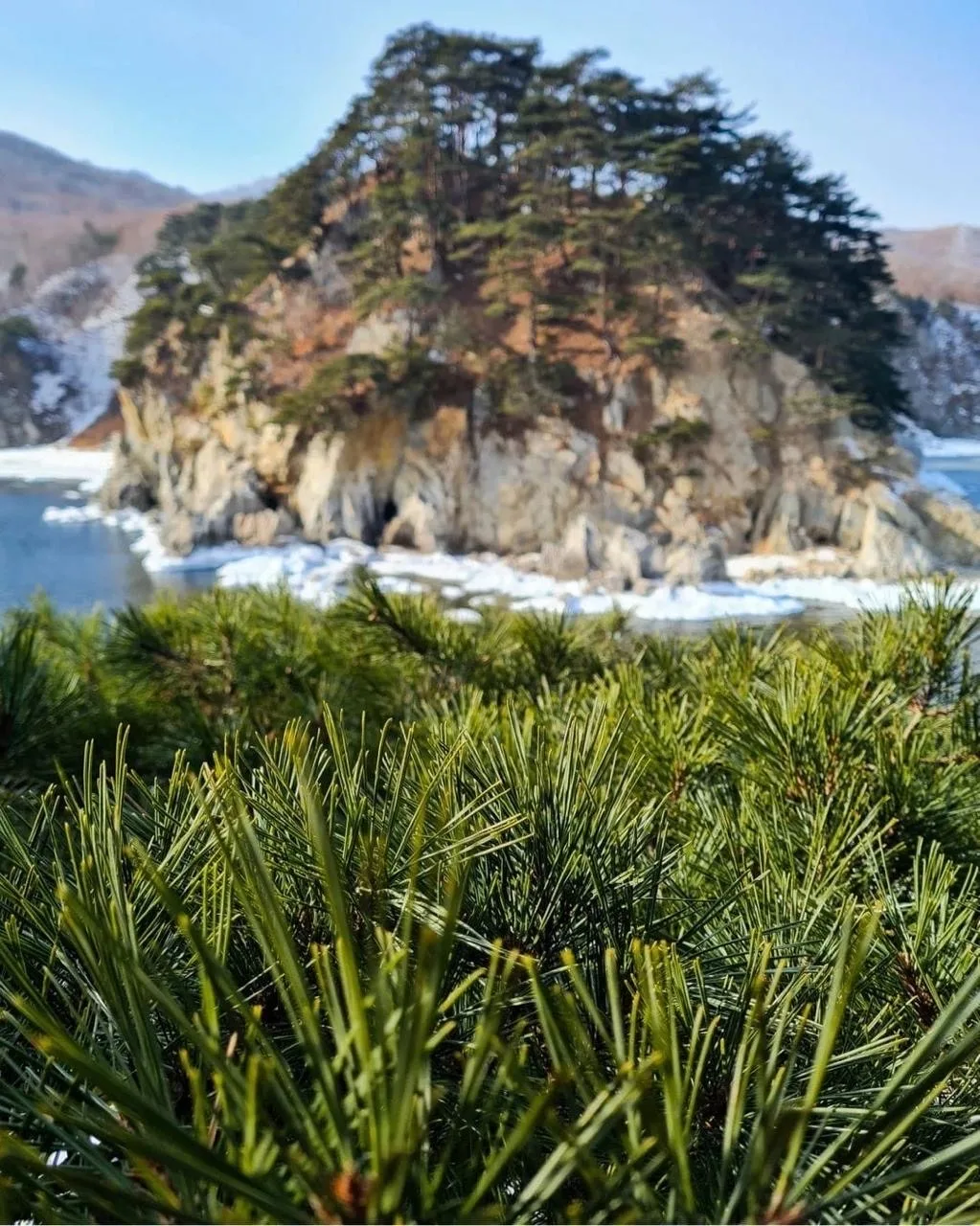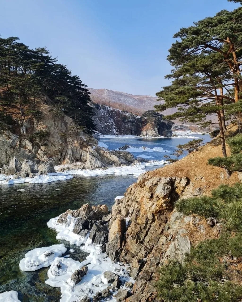 Крутые скалистые склоны покрыты вечнозеленой сосной густоцветковой. Это редкое дерево, которое встречается только в южном Приморье. Его ветви нависают над обрывом, создавая потрясающий вид.
