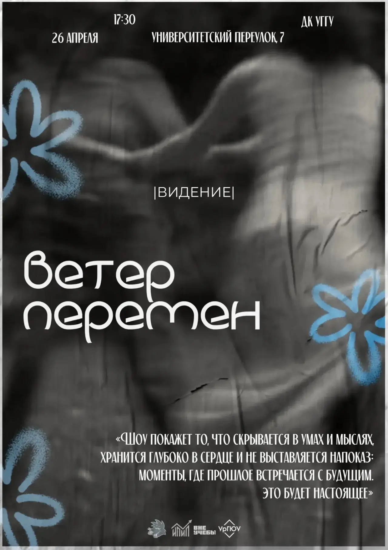 26 апреля в 17:30 на большой сцене ДК УГГУ состоится грандиозный шоу‑проект «ВИДЕНИЕ: ВЕТЕР ПЕРЕМЕН» - череда ярких выступлений, в каждое из которых вложена частичка души и безграничная любовь к творчеству