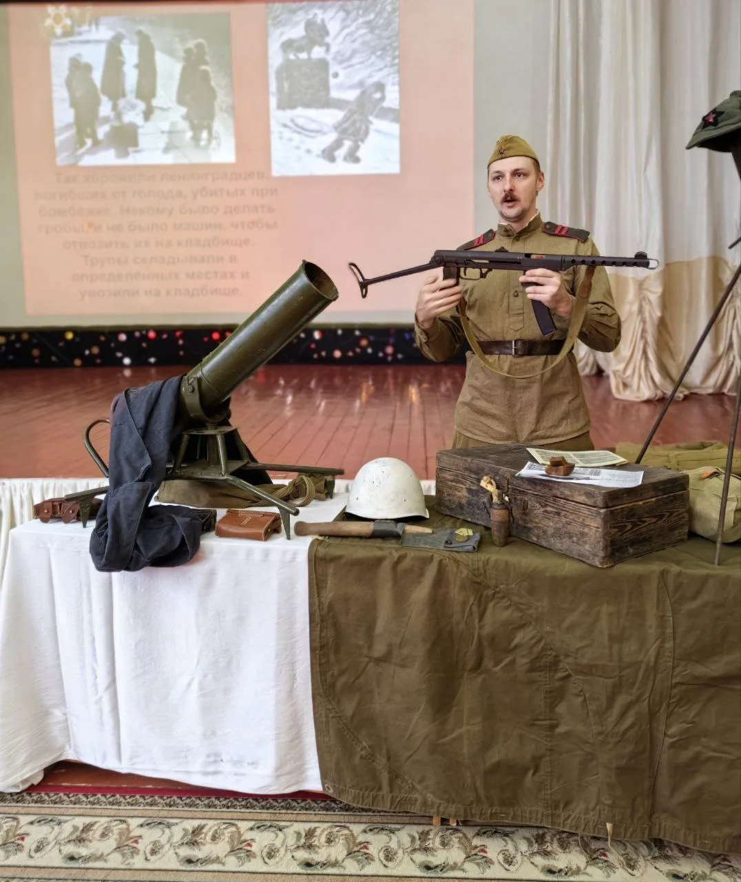 Приглашенный гость из краеведческого музея города Дятьково, Николай Шемякин, рассказал о тяжелых испытаниях, выпавших на долю жителей осажденного Ленинграда: об ужасах блокады, о героизме и стойкости ленинградцев, о строительстве спасительной «дороги жизни» через Ладожское озеро, о защите и обороне Ленинграда советскими солдатами.