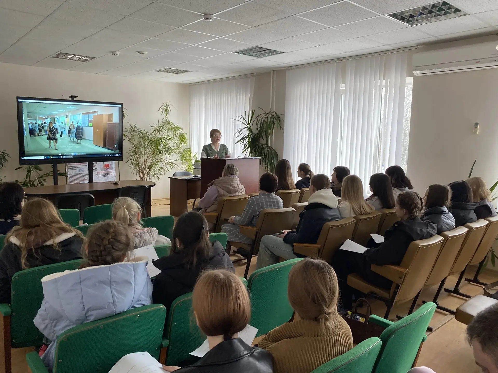 Заведующая терапевтическим отделением больницы М.С. Белькова обратилась в собравшимся с приветственным словом, рассказала о том, какие требования предъявляет современный мир к медицинским работникам и призвала собравшихся школьников поступать в медицинские институты и колледжи для дальнейшего трудоустройства в медицинские учреждения Унечского района и Брянской области.