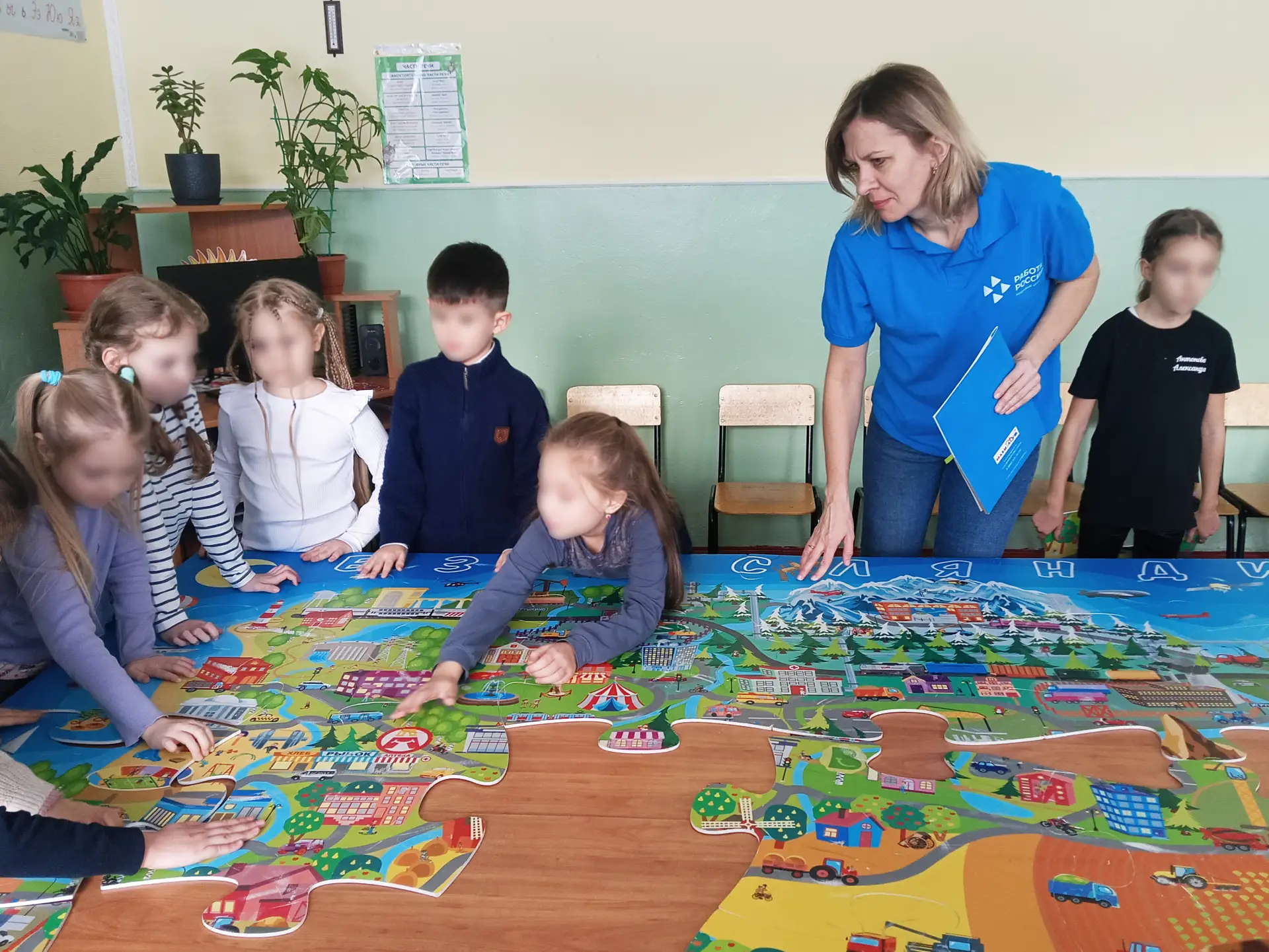 Продлёнка превратилась в маленькое приключение: дети с интересом собирали большие пазлы, чтобы увидеть общую карту мира "Взросляндии", на которой собраны все профессиональные сферы. Совместно со специалистами ребята разбирали элементы карты, искали здания больницы, пожарной части, полиции и администрации и тут же рассуждали о том, кто там работает.