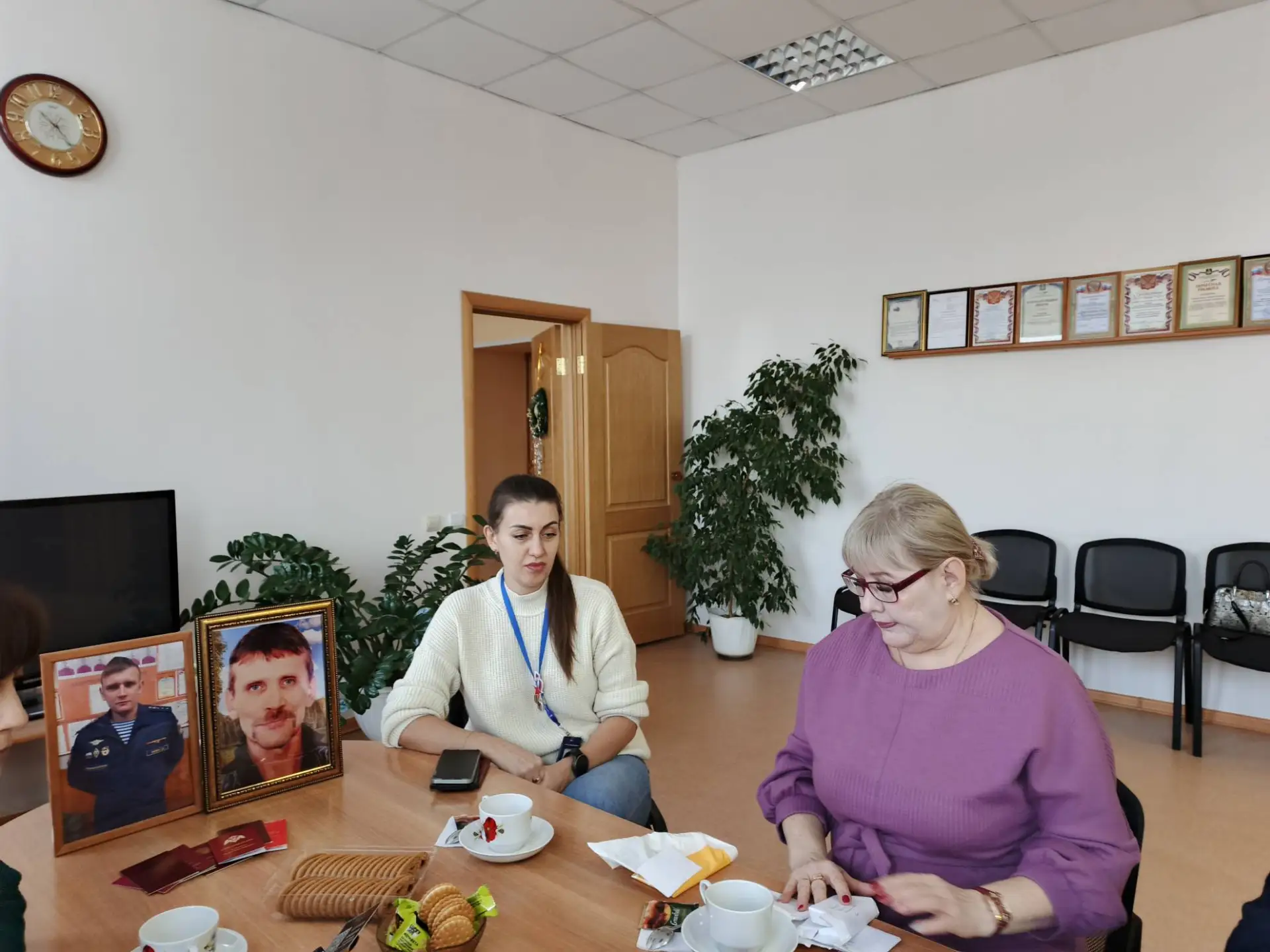 Жены погибших героев мужественно отозвались на предложение сотрудников Центра занятости. В теплой, дружественной обстановке, за чашечкой чая, гости рассказали о своих героических мужьях: о трудностях и лишениях воинской службы, о поступках, которые не измерить приказом и конечно, о подвигах героев, о мужестве, верности и силе духа.