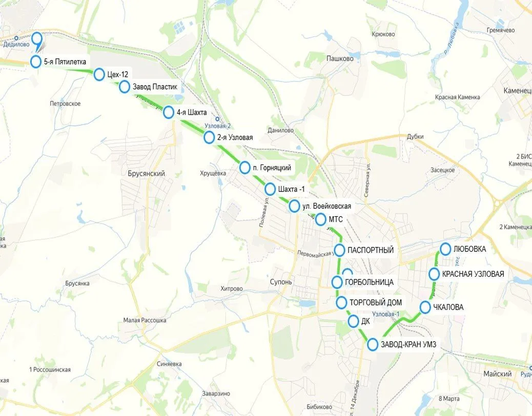 Перевозки осуществляются по следующему перечню остановочных пунктов: 5-я Пятилетка, Цех-12, Завод Пластик, 4-я Шахта, 2-я Узловая, п. Горняцкий, Шахта №1, ул. Воейковская, МТС, Паспортный, Горбольница, Торговый дом, ДК, Завод, Кран УМЗ, Чкалова, Красная Узловая, Любовка.