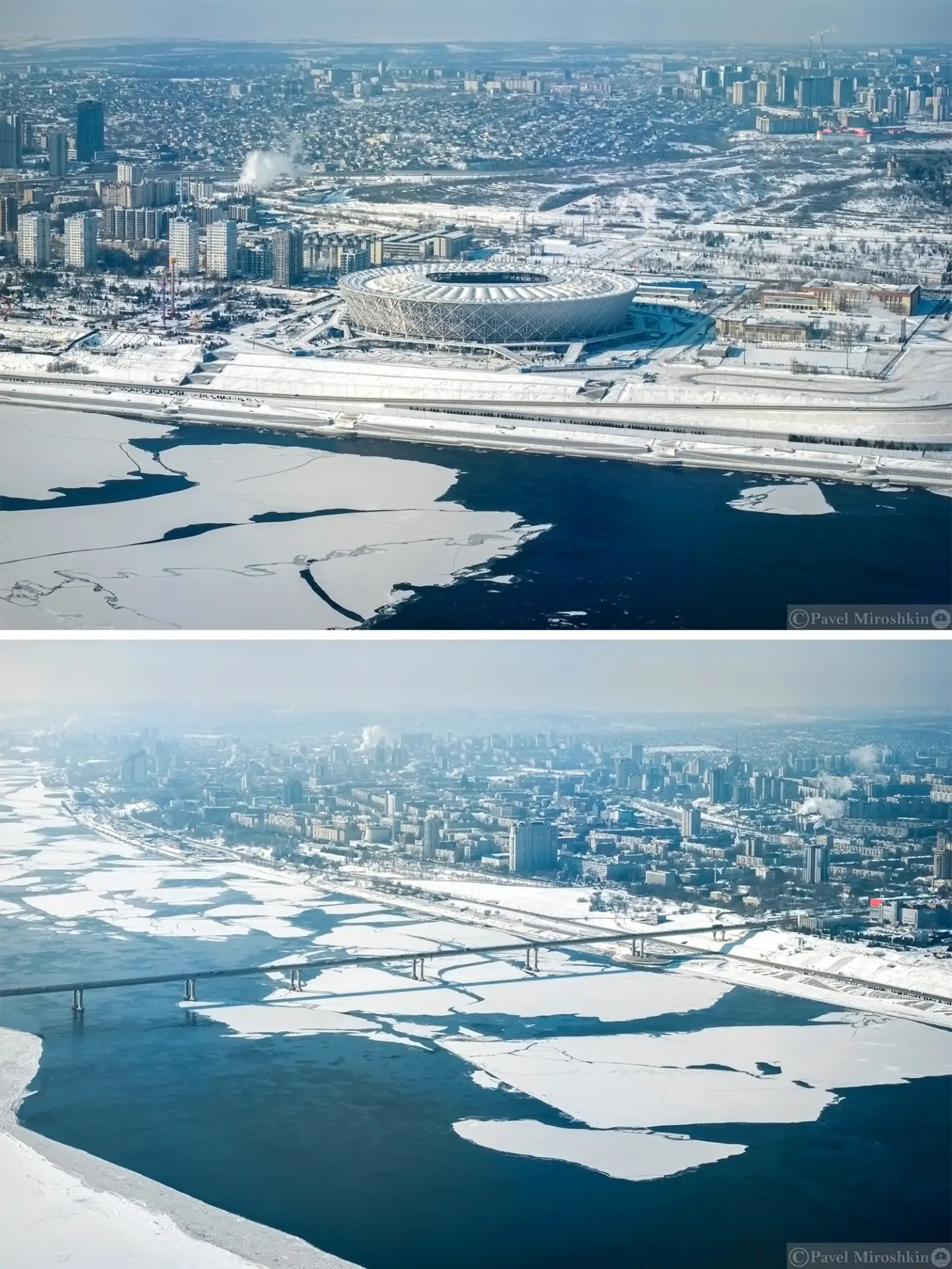 Зимняя Волга с высоты птичьего полёта в объективе волгоградского фотографа [https://vk.com/wall-114859149_629|Павла Мирошкина]! 👏😍