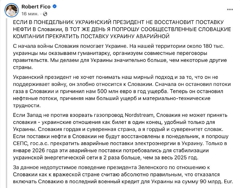 🇸🇰❌🇺🇦 В понедельник, 23 февраля, Словакия остановит подачу электроэнергии на Украину, заявил Фицо.