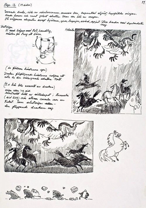 Работая над книгой, Туве Янссон использовала и довольно необычную технику — она изрисовывала вариантами иллюстраций целые листы.