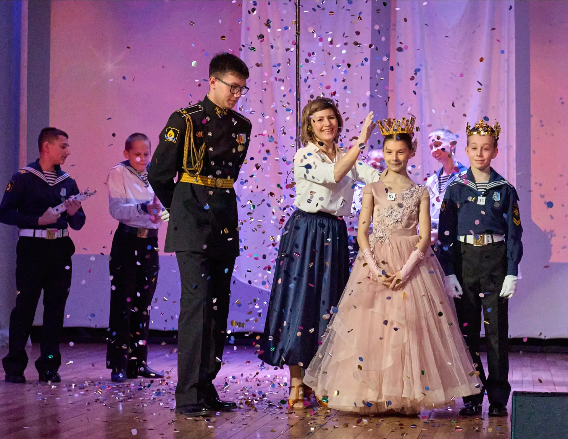 Открыл торжество величественный полонез, затем свой творческих дар-благодарность офицерам флота преподнесли воспитанники 4/8 класса Академии – Арина Черданцева и Олег Сомохин, исполнив дуэт на музыку А. Дворжака (класс педагогов Н.В. Пермяковой и А.А. Ермоленкова). Далее следовал ряд разнообразных – лиричных, бравурных, стремительных и элегантно-изящных танцев, воссоздававших атмосферу Онегинской эпохи.