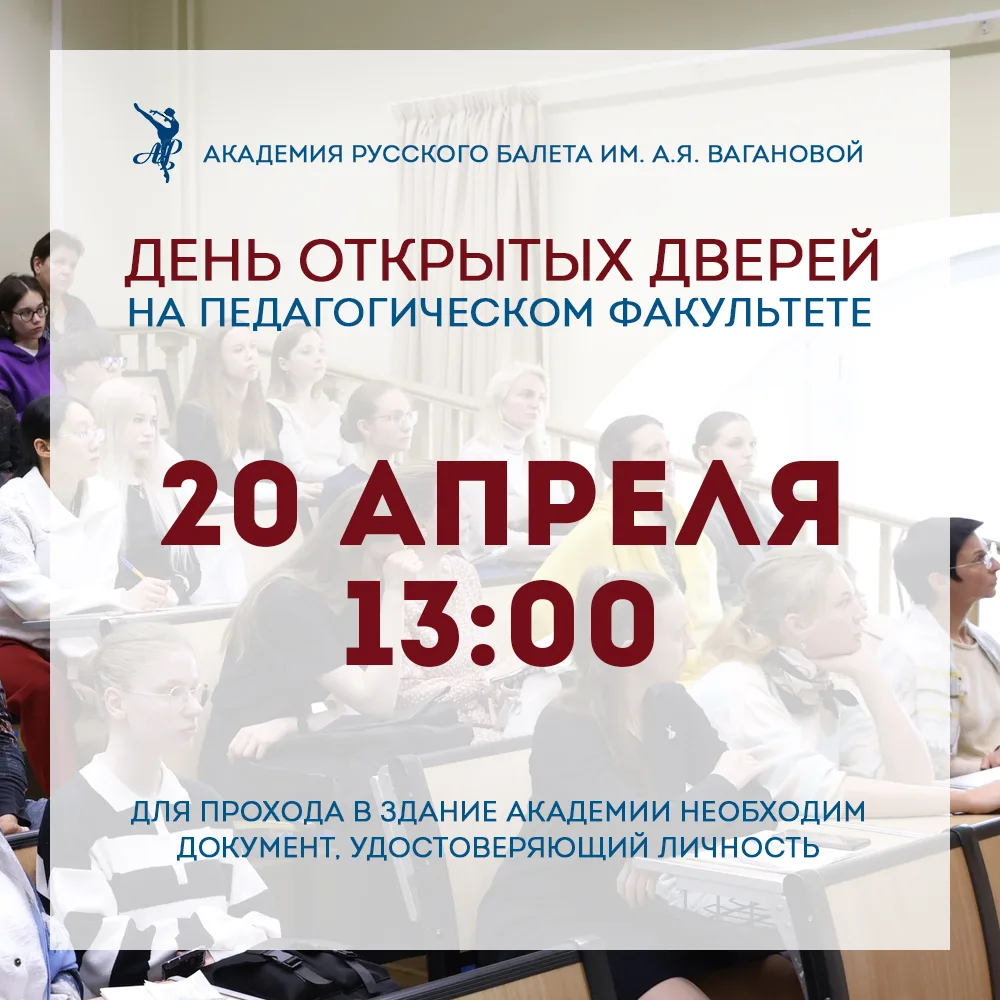 ДЕНЬ ОТКРЫТЫХ ДВЕРЕЙ на Педагогическом факультете Академии Русского балета имени А.Я. Вагановой пройдет 20 апреля. Начало в 13.00.