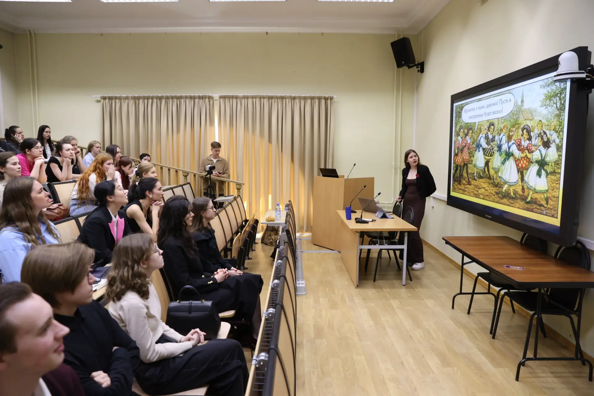 В нём приняли участие более 40 студентов всех курсов и уровней обучения – от первокурсников бакалавриата до второкурсников магистратуры. 10 участников представили 8 сообщений на предложенную тему «Мир хореографии». Примечательно, что все выступления были решены в различной тематике и стилистике. В итоге получился увлекательный разговор о классическом балете, джазовом танце и мюзикле, параллелях между различными жанрами искусства, выставках о танце, а также о вопросах театрального этикета. Ребята не только анализировали и теоретизировали, но и танцевали.