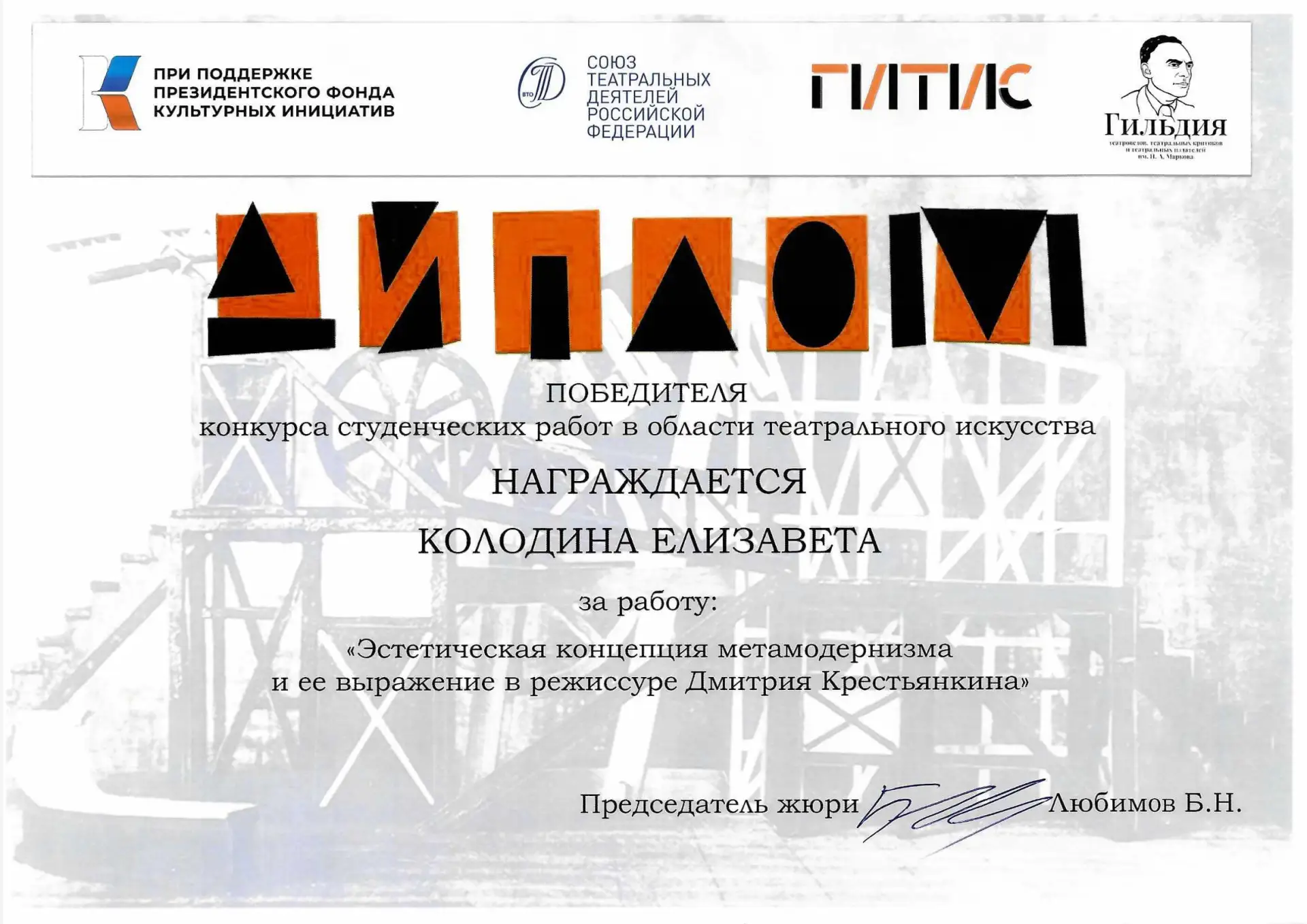 Елизавета представила на конкурс работу «Эстетическая концепция метамодернизма и её выражение в режиссуре Дмитрия Крестьянкина». В конкурсе участвовало около 100 работ со всей страны.