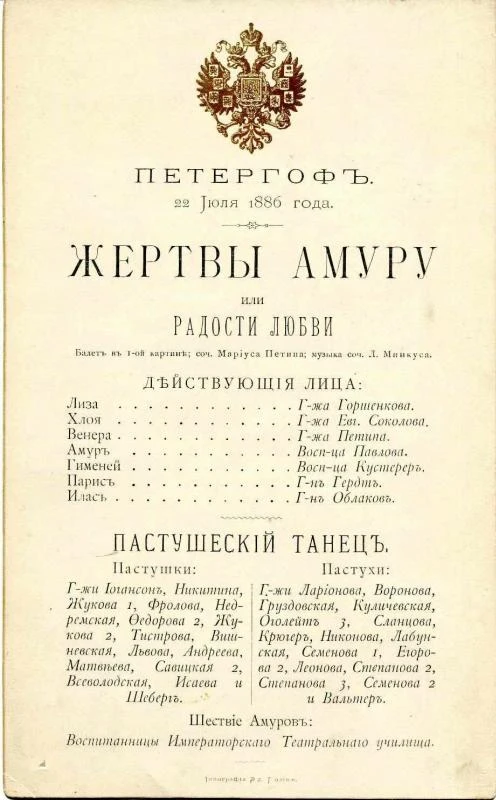 Последним балетом, сочиненным Людвигом Минкусом в должности штатного композитора, стал «Жертвы Амуру, или Радости любви». Летом 1886 г. он был уволен, а его должность аннулирована. Минкусу предоставили прощальный бенефис – единственный за всю его службу. С этого времени в практику театра вошли конкурсы на выбор автора музыки к хореографическому спектаклю. Последним же балетом Минкуса, созданным в сотрудничестве с М. Петипа, стал «Калькабрино». В год его премьеры композитор покинул Россию и вернулся в Вену. Балетов он более не сочинял и умер спустя два месяца после Октябрьской революции.