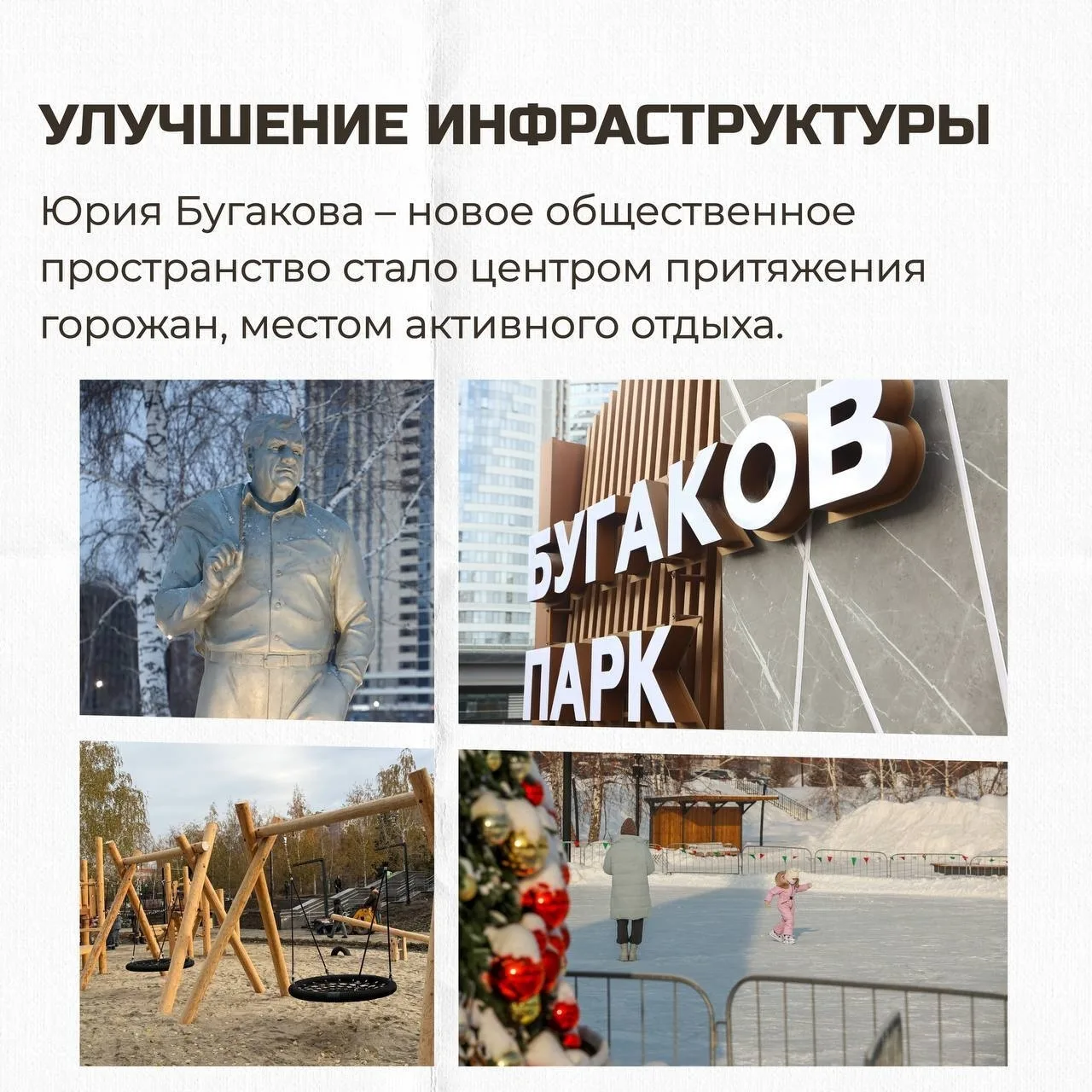Мэр Новосибирска Максим Кудрявцев подчеркнул позитивную динамику по ряду ключевых показателей социально-экономического развития и отметил: «Завершён первый этап строительства парка имени Юрия Бугакова – новое общественное пространство стало центром притяжения горожан, местом активного отдыха. Летом эту работу продолжим».