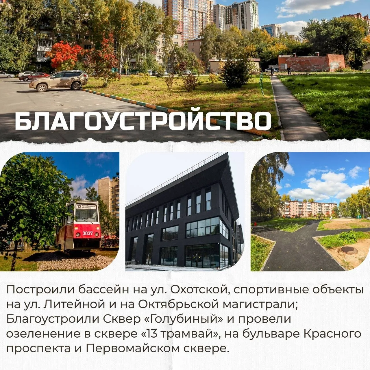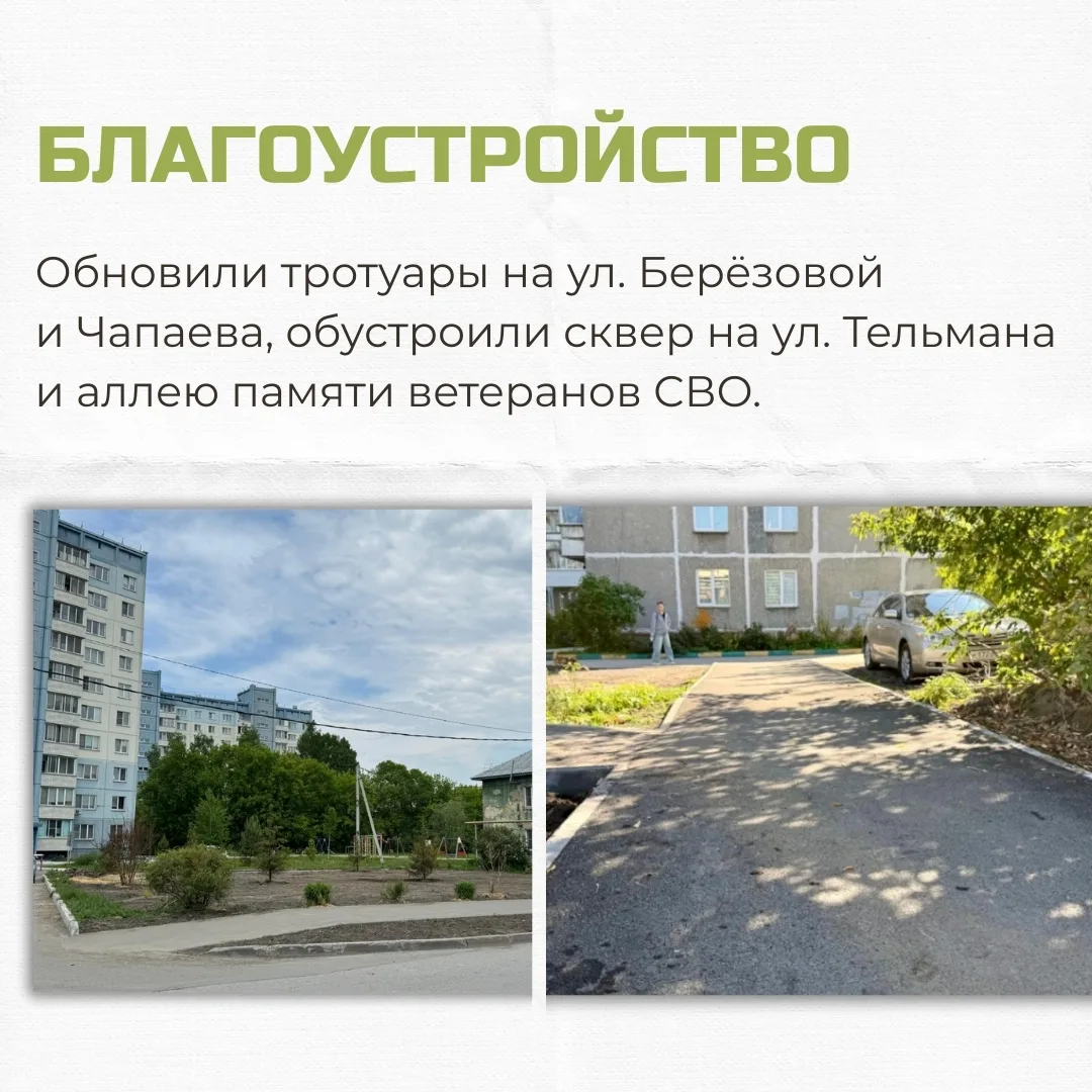 — Обновили тротуары на ул. Берёзовой и Чапаева, обустроили сквер на ул. Тельмана и аллею памяти ветеранов СВО, отремонтировали памятную стелу на Бердском шоссе;
