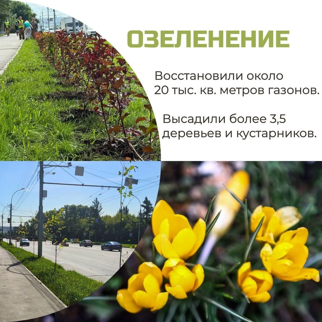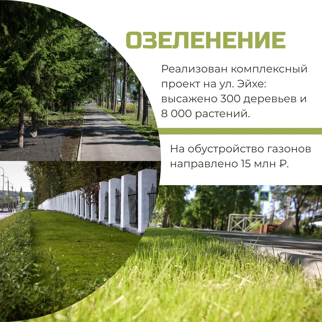 — Выделили 15 млн рублей на обновление газонов вдоль магистралей и завершили комплексный проект на ул. Эйхе — здесь появились тротуары, скамейки, урны и деревья;