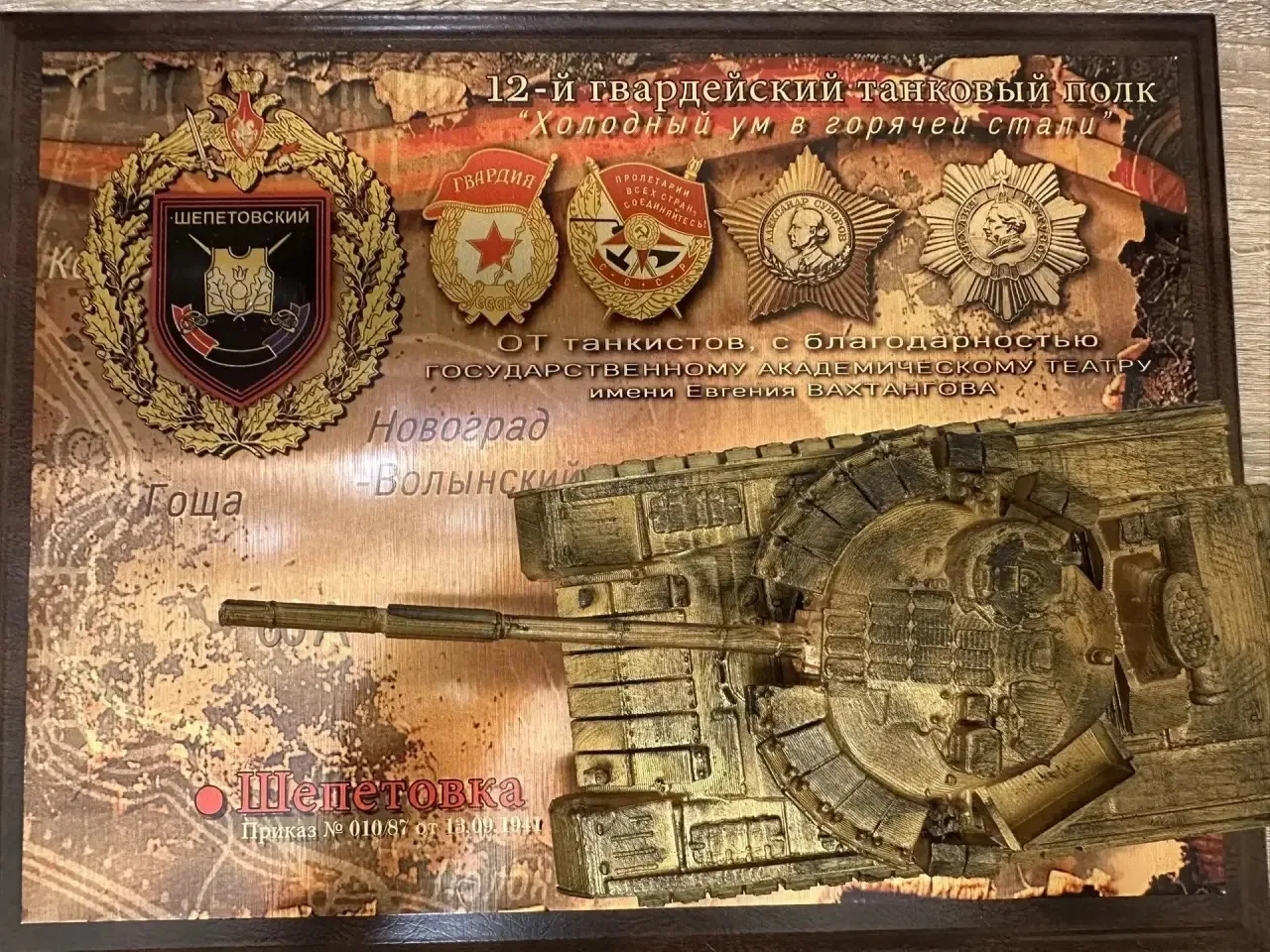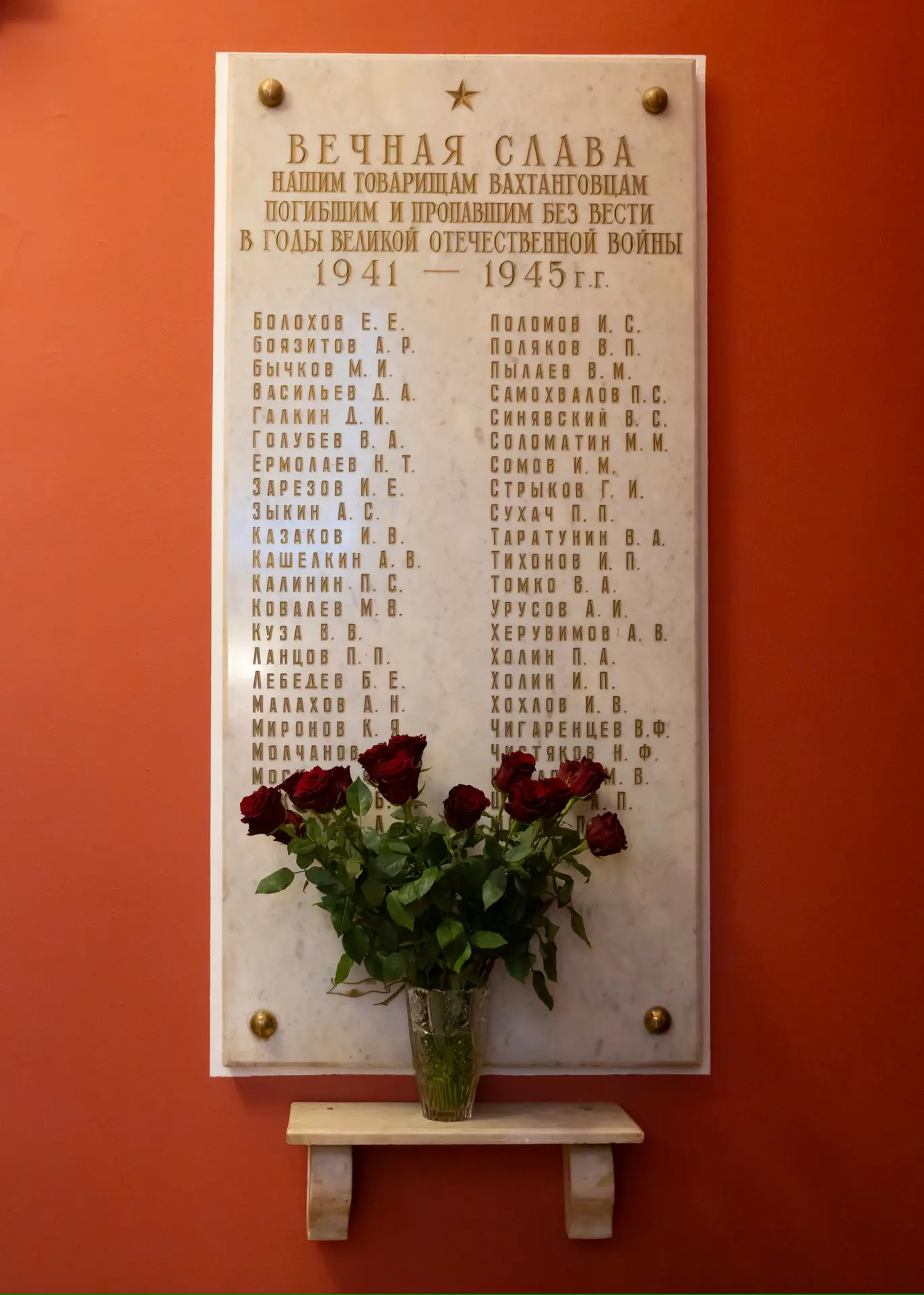 Одна из многолетних славных традиций Театра Вахтангова — собираться у мраморной доски в Большом портретном фойе в День Победы. В мраморе запечатлены имена Вахтанговцев, защищавших нашу Родину и погибших в годы Великой Отечественной.