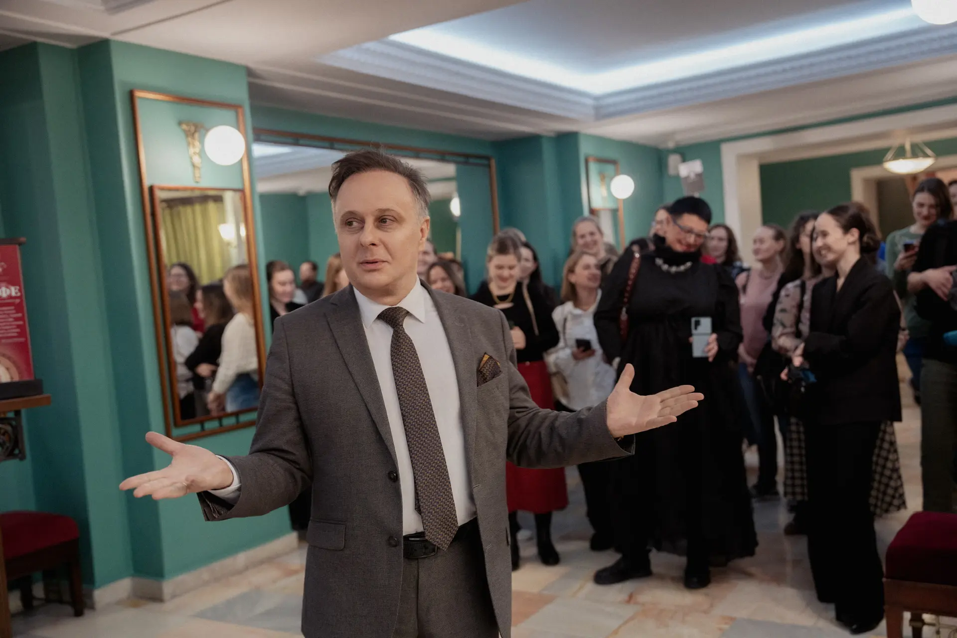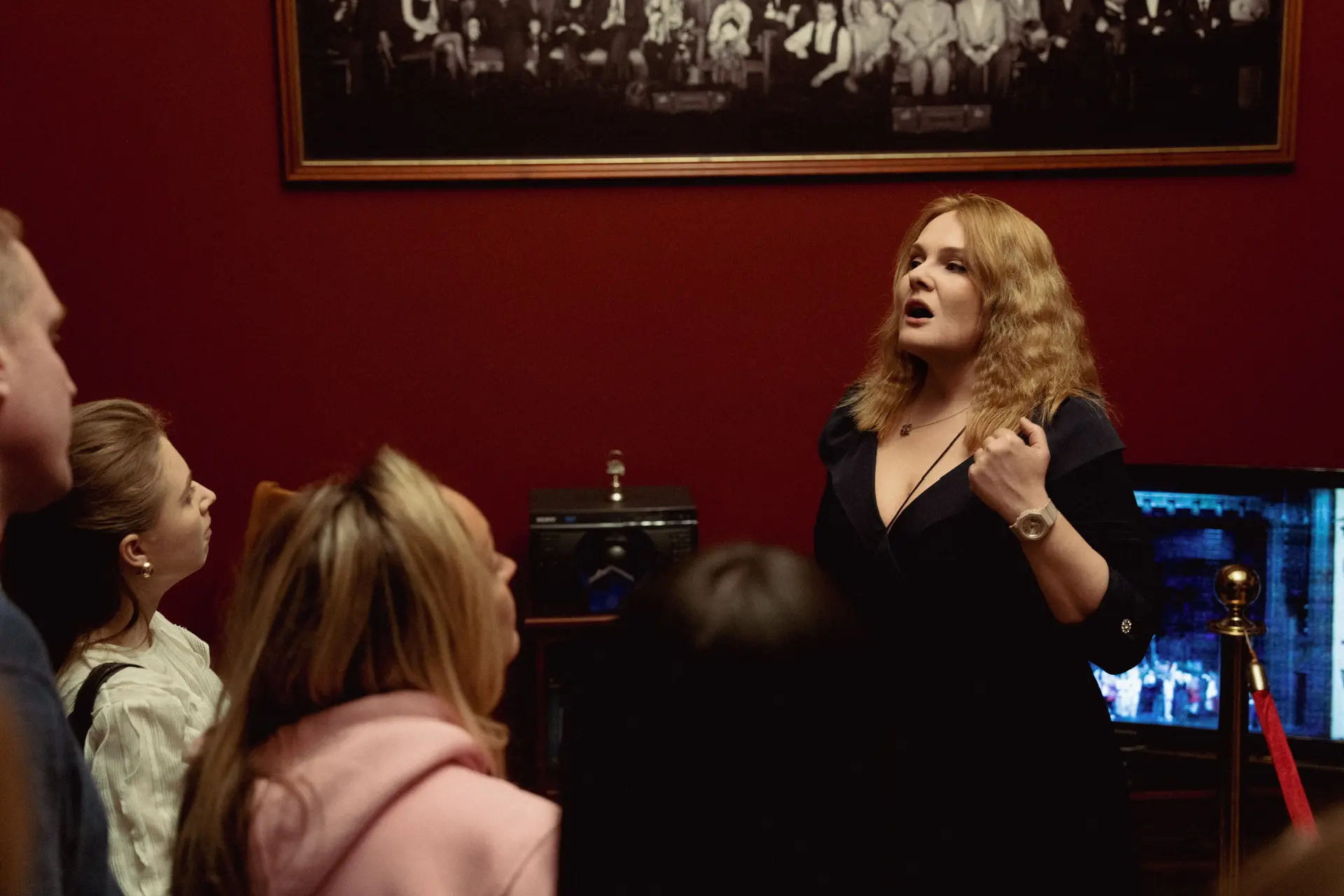За 104 года своей истории наш театр накопил множество легенд и былей, которые звучат как самые увлекательные мифы. Любая точка маршрута, любой вопрос зрителя может послужить началом для очередного сюжета. К примеру, в фитнес-зоне начинаем говорить о физической подготовке артистов, логически переходим к теме танца и вокала, репетиций и распорядка дня сотрудников, а дальше нить повествования может протянуться к тому, что в 2025 году в Москве было сыграно рекордное количество спектаклей: 1364! Или можем заговорить о логистике гастролей… или вовсе перенестись во Владикавказ на родину Евгения Богратионовича Вахтангова…