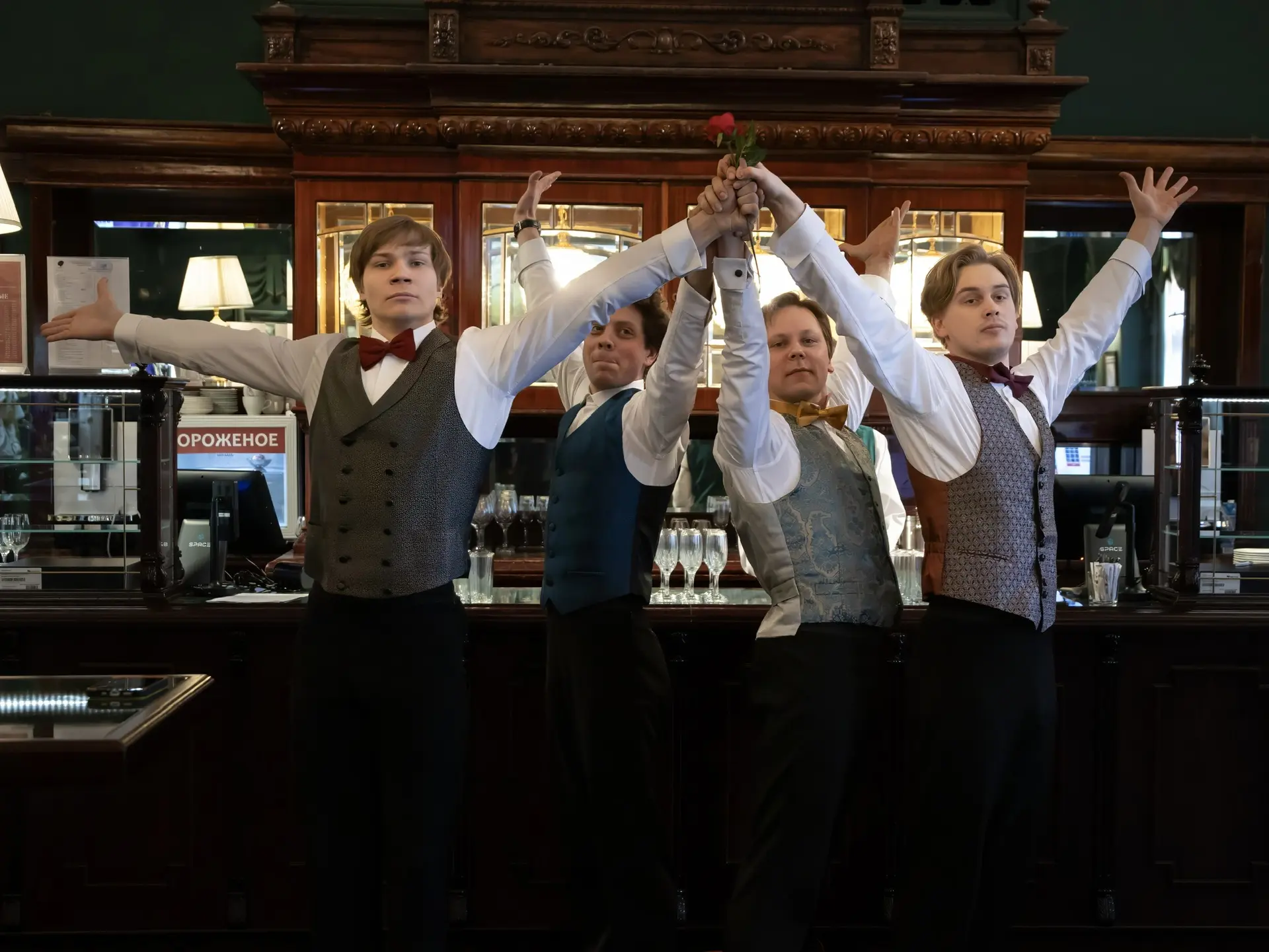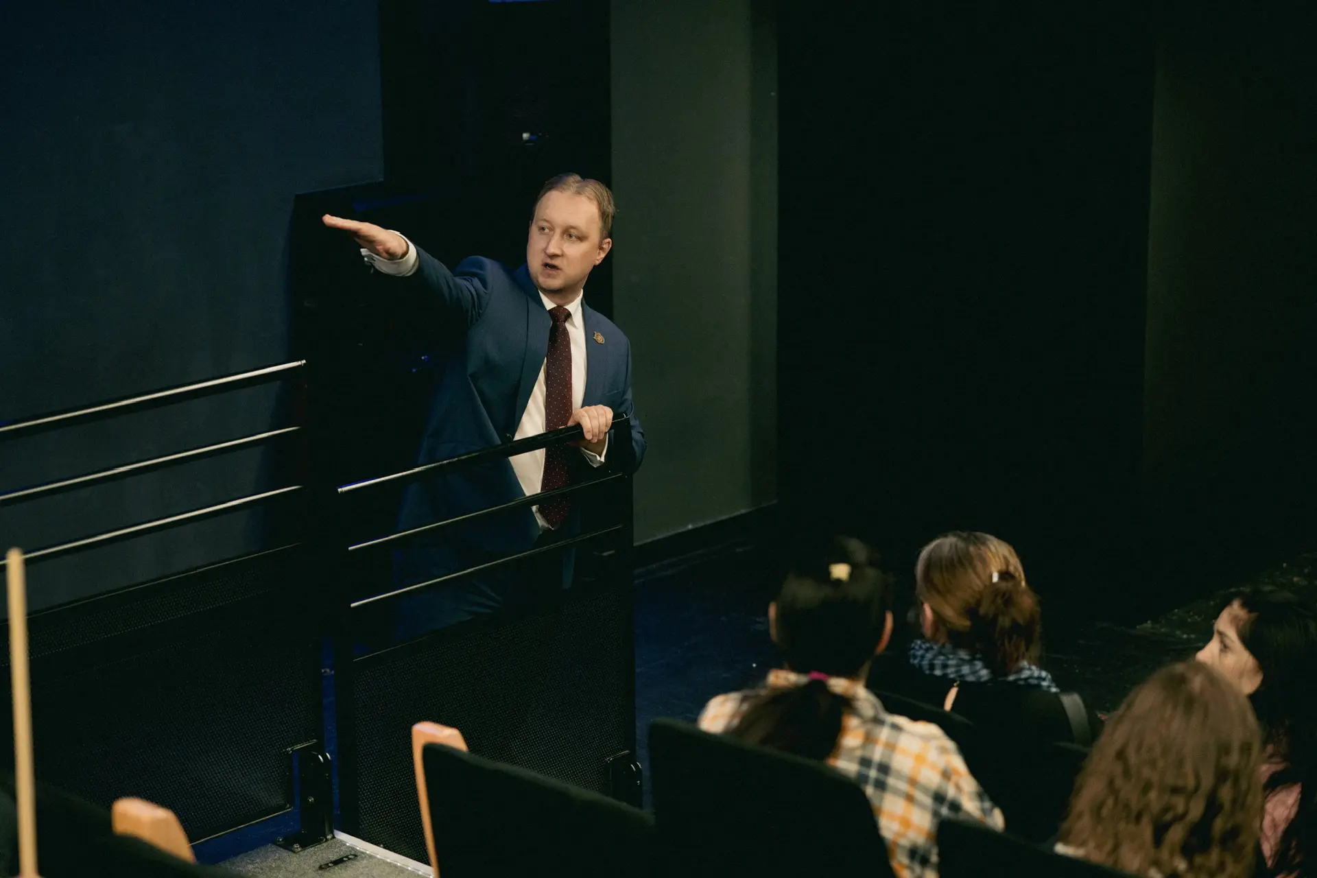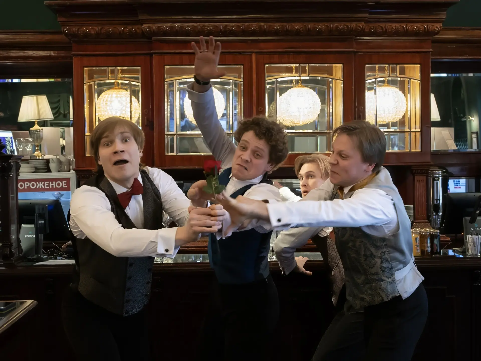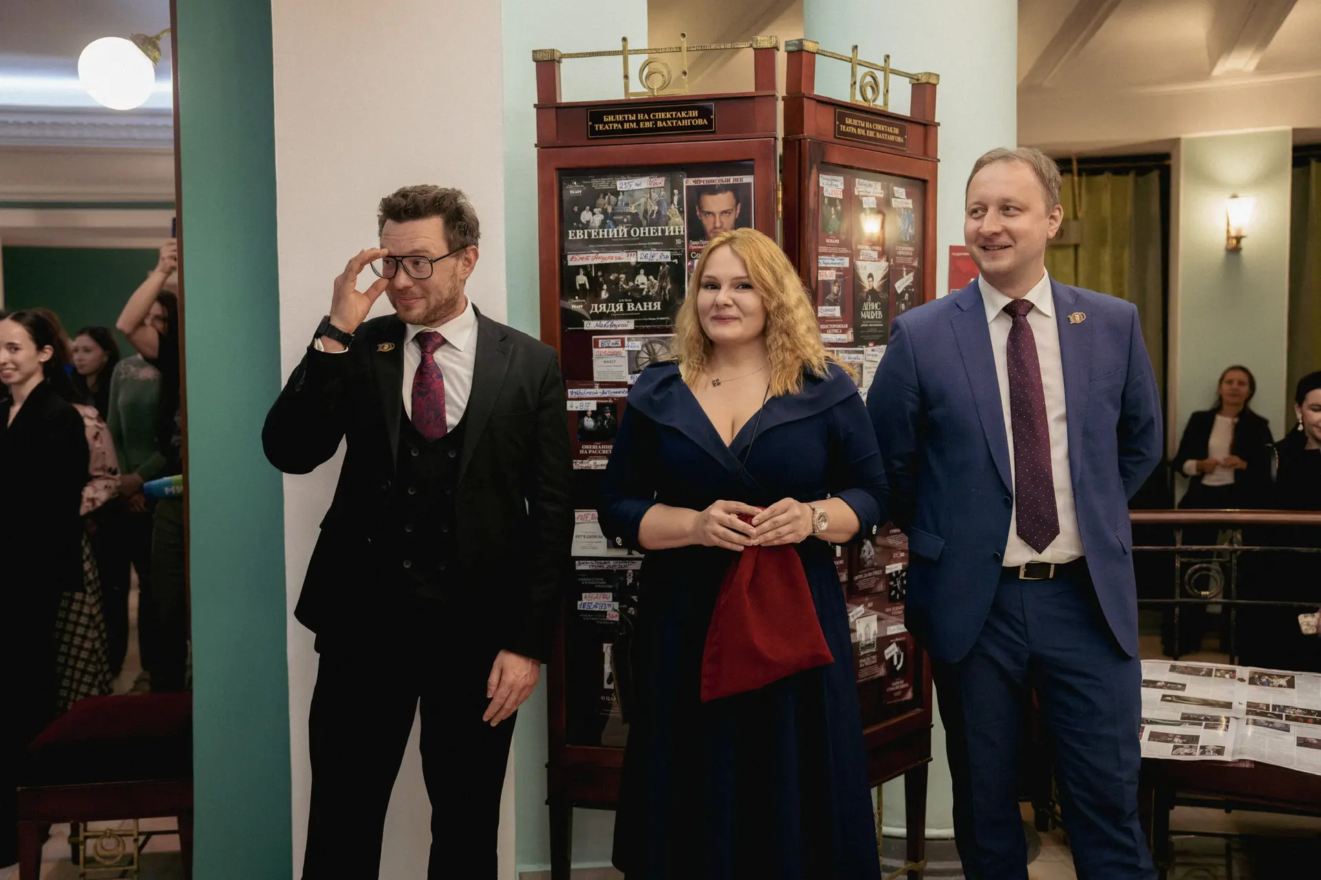 Ведущие: директор Театра Вахтангова Кирилл Крок, заместители директора Антон Прохоров и Алексей Никитин, маркетолог Денис Сутыка и начальник отдела по связям с общественностью Дария Хаустова.