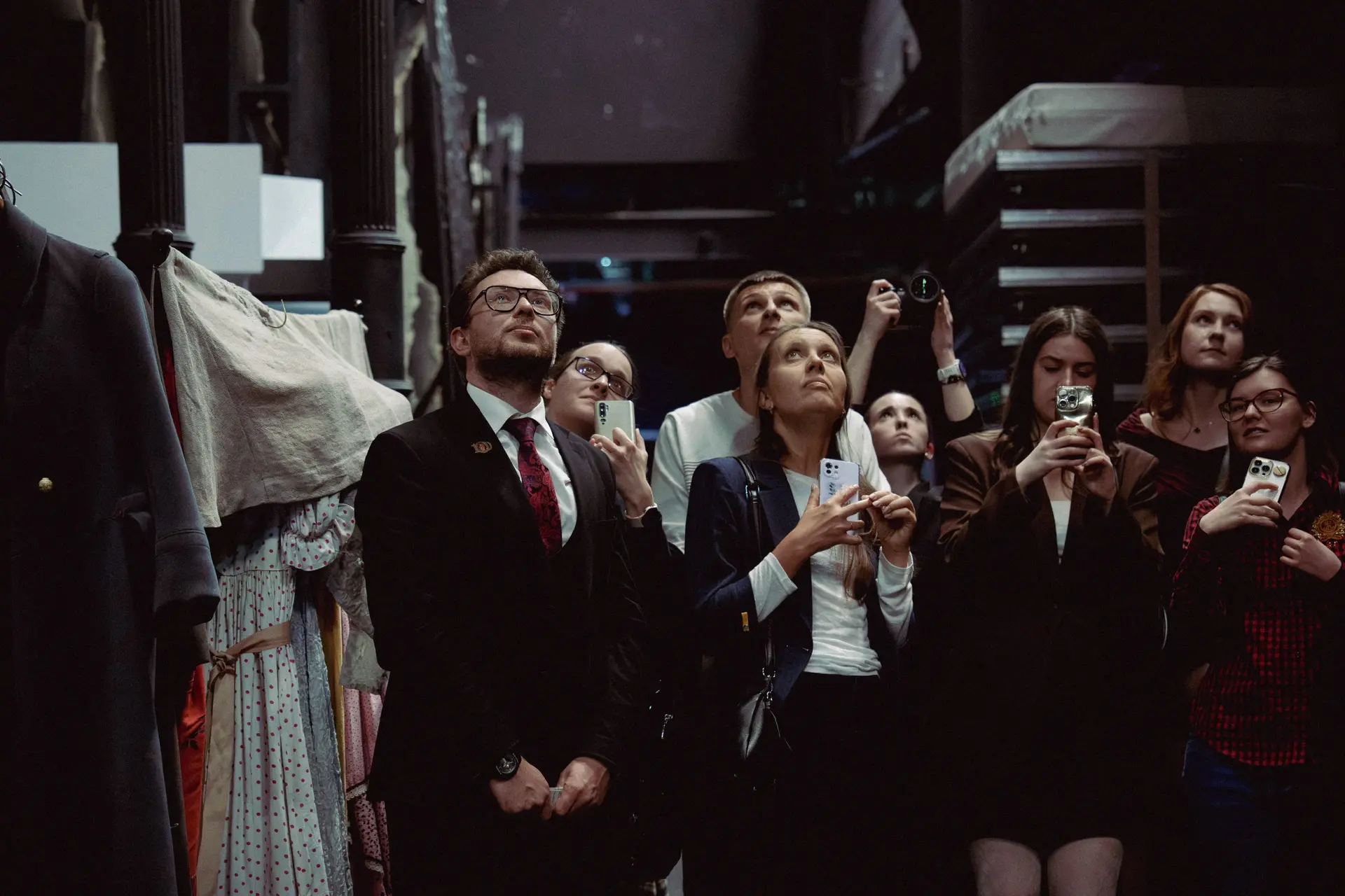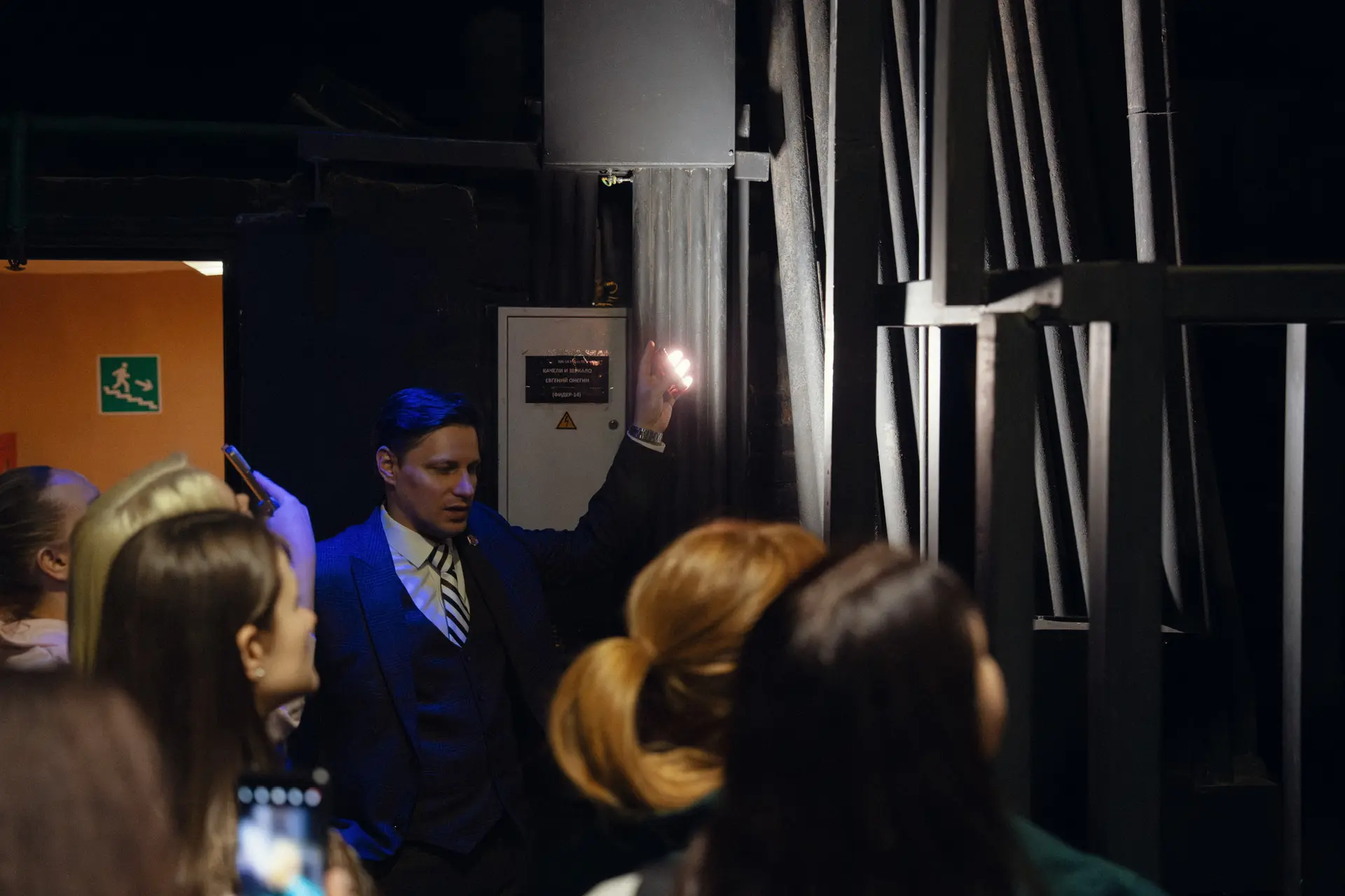 Специально не включили в ночную экскурсию привычные пространства дневных программ: кабинет трёх художественных руководителей, экспозал, зал «Пристань», правительственную ложу и пр., зато побывали там, где далеко не все сотрудники-то оказываются. Например, на рабочей галерее в 8 метрах над планшетом исторической сцены, разглядывали обрешётку колосников, посещали репетиционный зал «Чердак» и многое другое.
