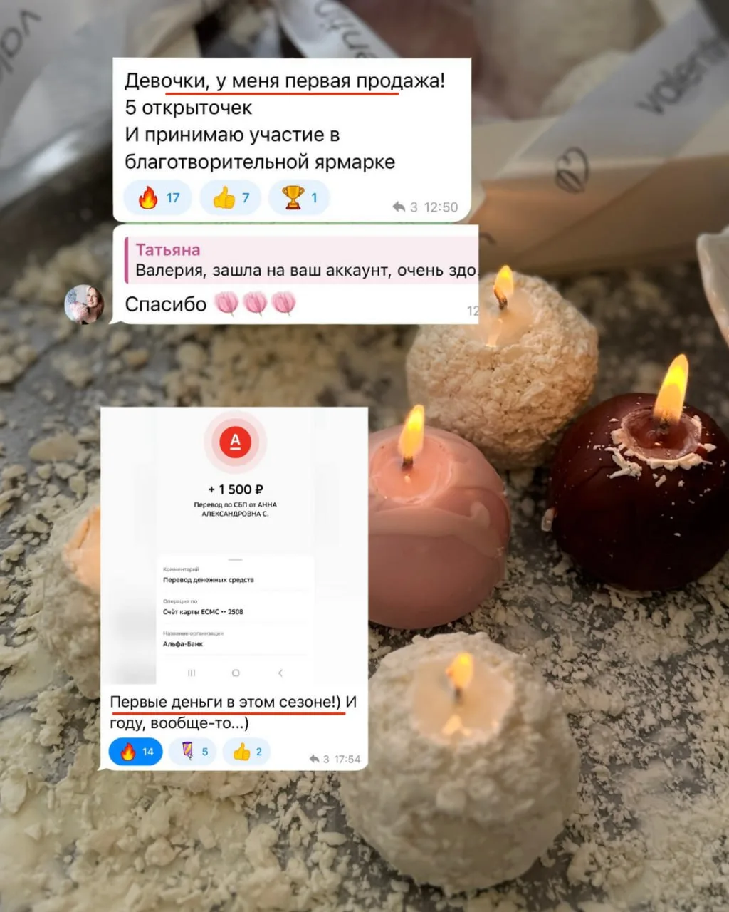 Просто прочитайте отзывы! Там про первые предоплаты, которые уже пришли. Там про первые деньги за работы, которые ещё вчера казались "ну кто же это купит". Там про решимость наконец-то показать своё творчество миру, а не прятать на полку. Там про оформление сообщества ВКонтакте, которое теперь работают на продажи. И даже про выход на телевидение ТНТ — да-да, одна из участниц будет там!