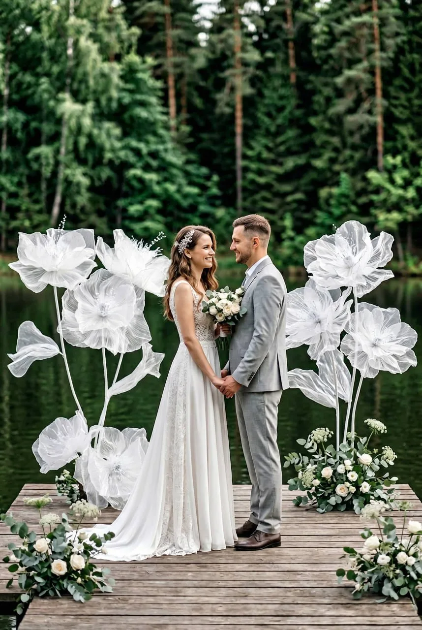 Этот курс очень хорошо показывает, что технику можно переносить на любые ткани, материалы и размеры. Я именно так и сделала. Знания из курса я использовала для создания абстрактных цветов из вуали. даже одна фотозона «Счастье в простом» — это клад информации, если правильно её применять.