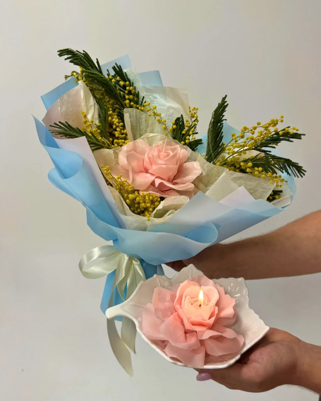 Букет-комплимент из свечей-цветов может стоить вам буквально 300 рублей в себестоимости, а выглядеть на все 3000. Вся фишка — в правильной упаковке и подборе цвета.