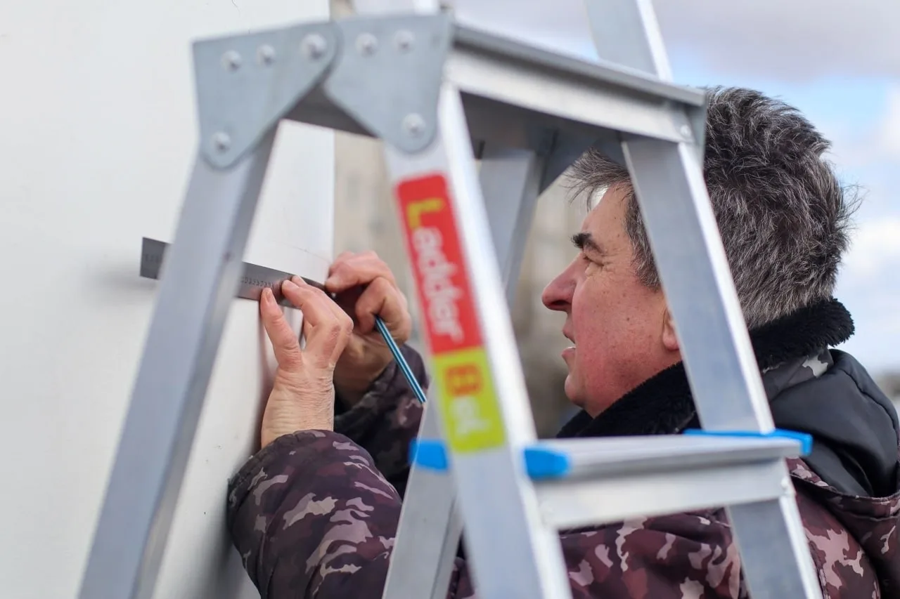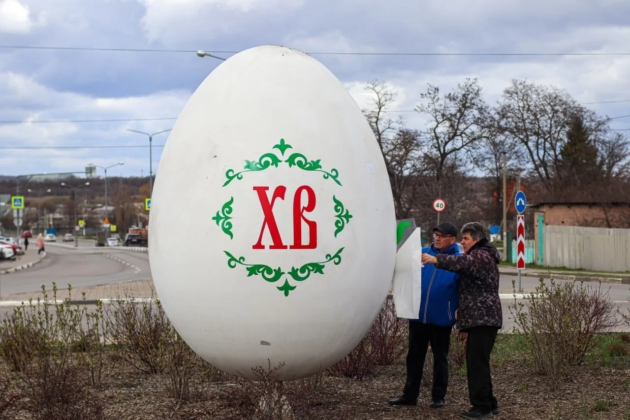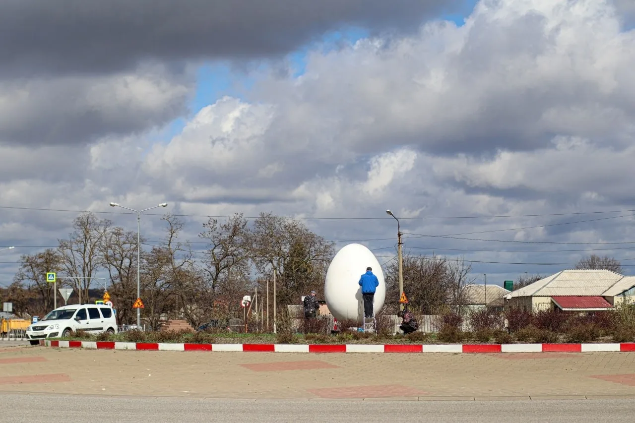 Арт-объект на въезде в центр посёлка подготовили сотрудники местного «Дома детства» совместно с ЖБК-1 и администрацией, несмотря на сирену. Учли просьбы жителей — надписи и вязь стали крупнее. Директор «Дома детства» Андрей Геннадьевич, основатель традиции 15 лет назад, рассказал, что в этом году у украшения яйца юбилей.