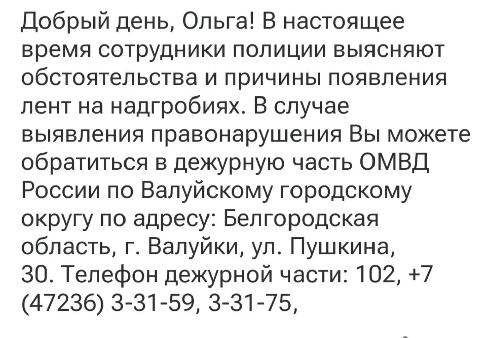 «В настоящее время сотрудники полиции выясняют обстоятельства и причины появления лент на надгробиях. В случае