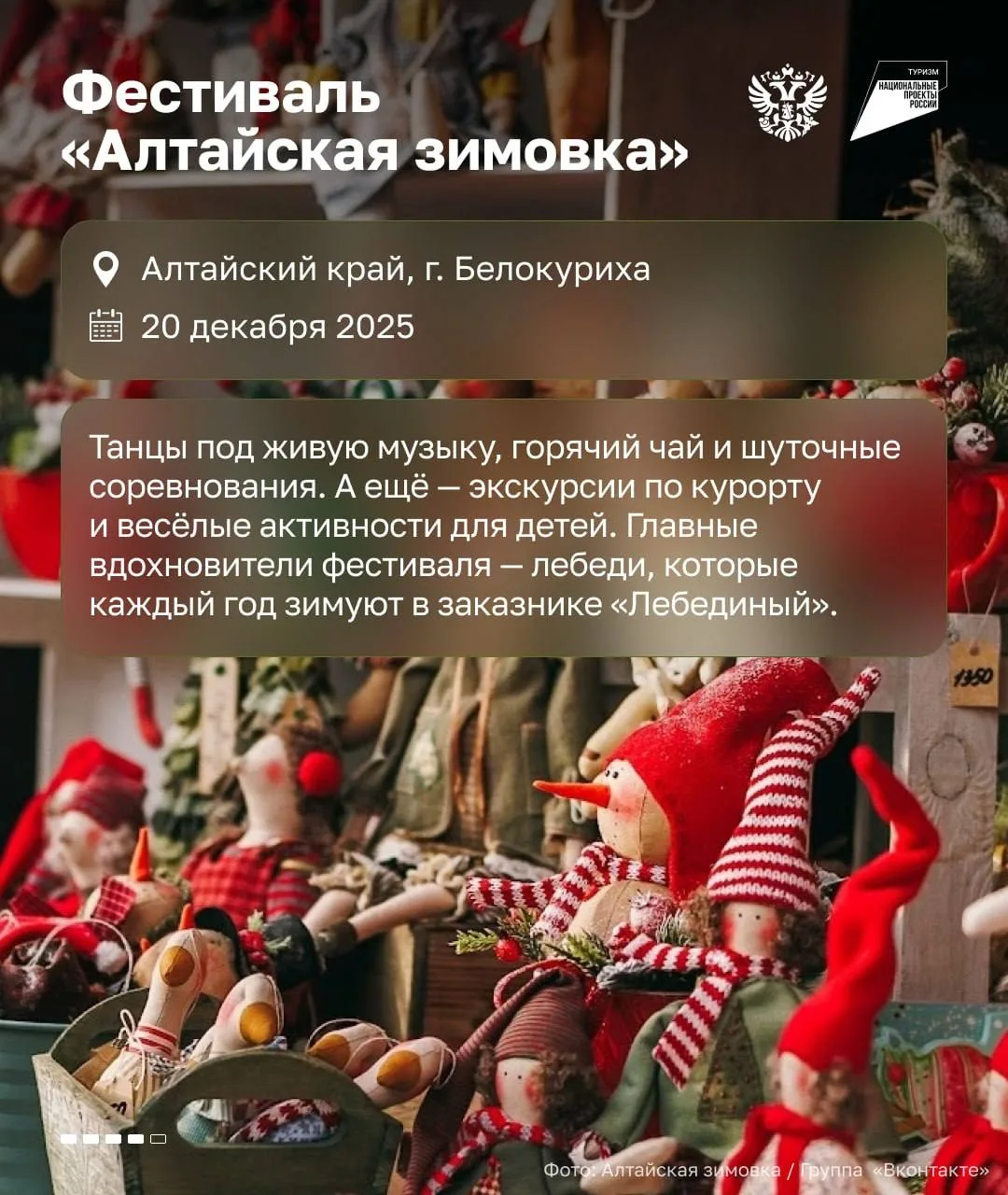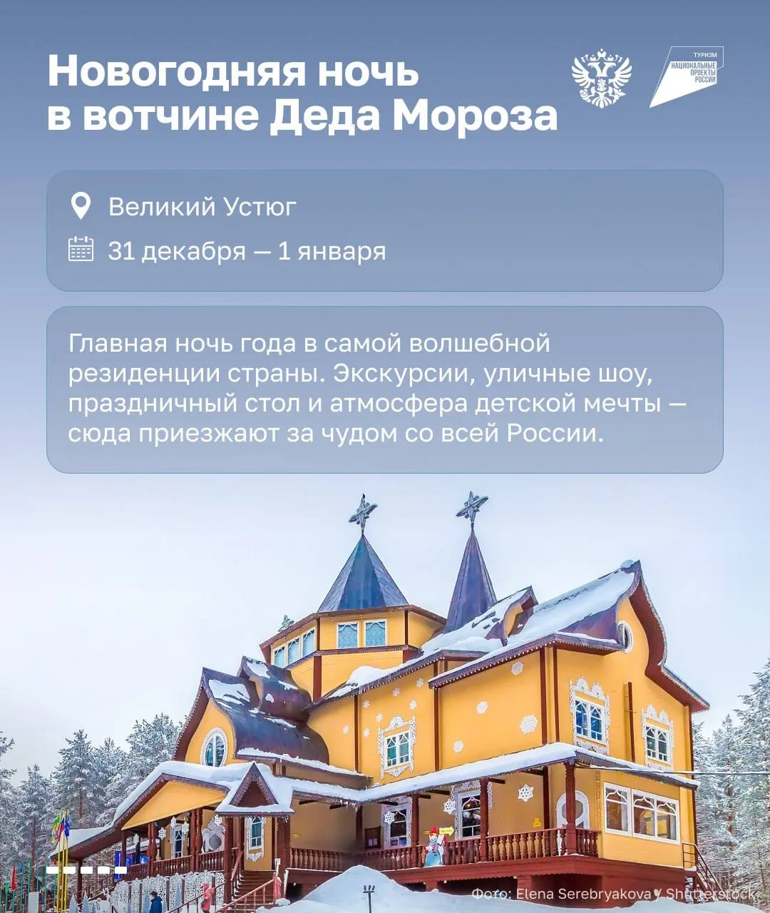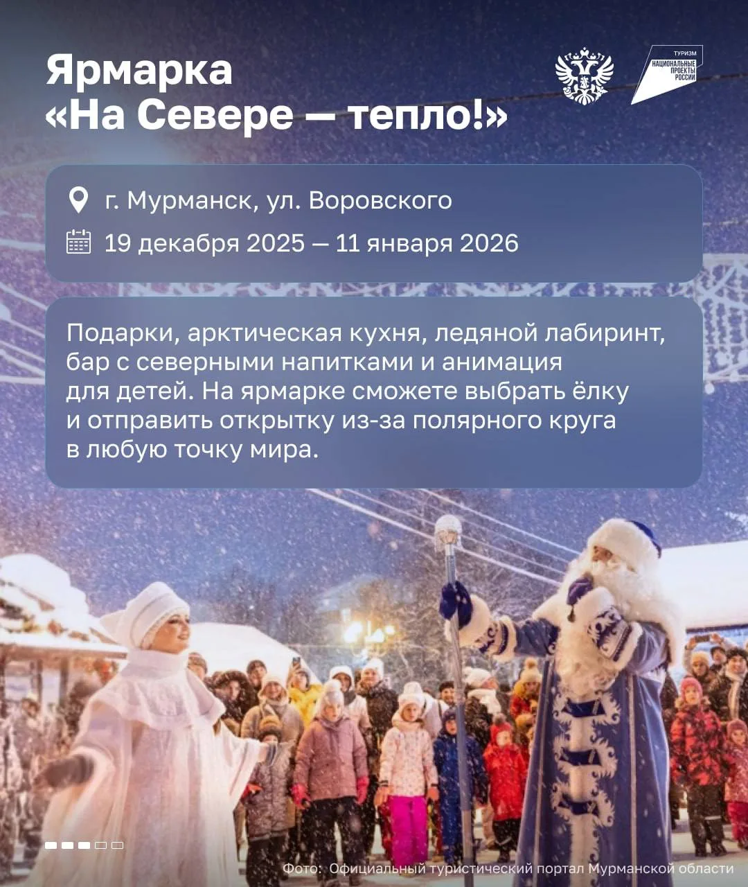🎄Посетить ледовое шоу, побывать на фестивале новогодних елей, найти интересные вещицы на заполярной ярмарке, отведать вкусностей на базарах – яркие события в разных уголках страны собрали в карточках!
