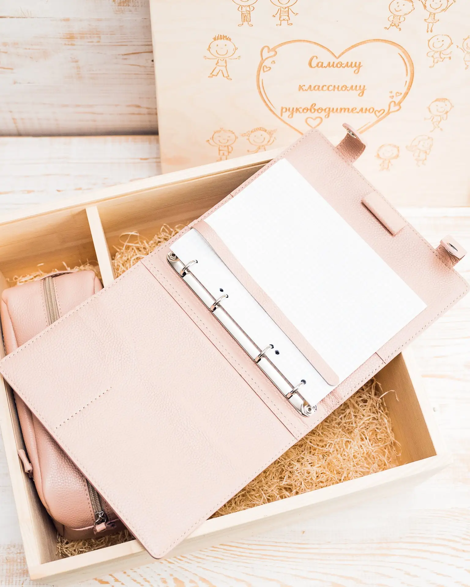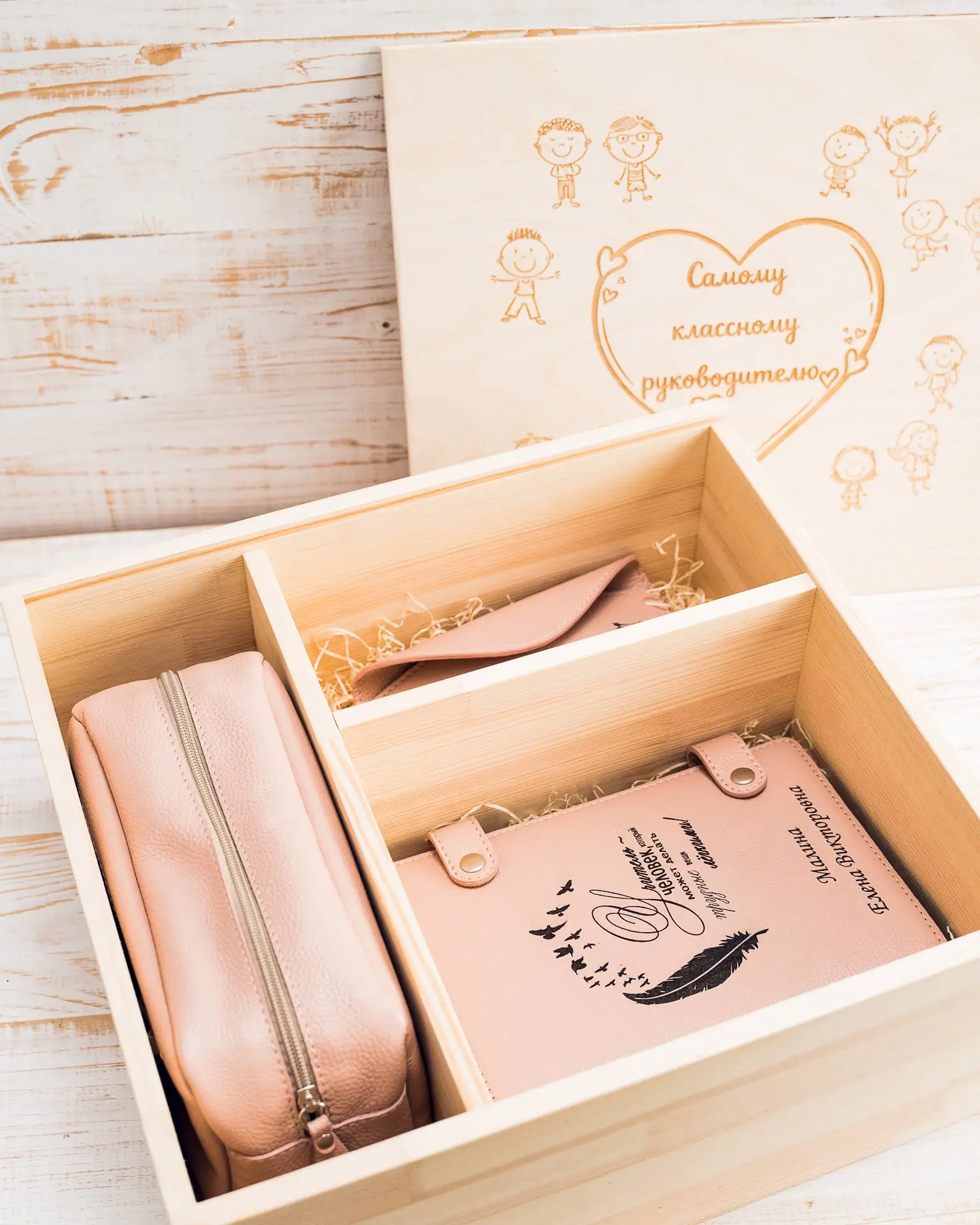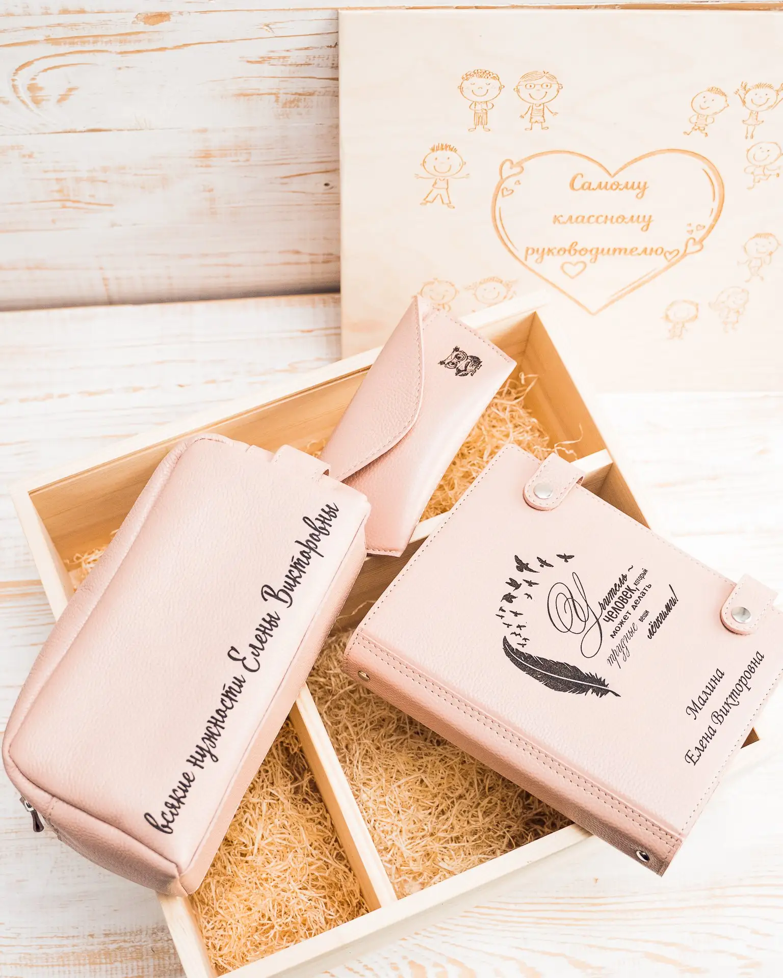 Но можно не ограничиваться блокнотом, а собрать целый набор изделий, как в примере на фото. В таком случае цена рассчитывается индивидуально - зависит от конкретных изделий и гравировок.