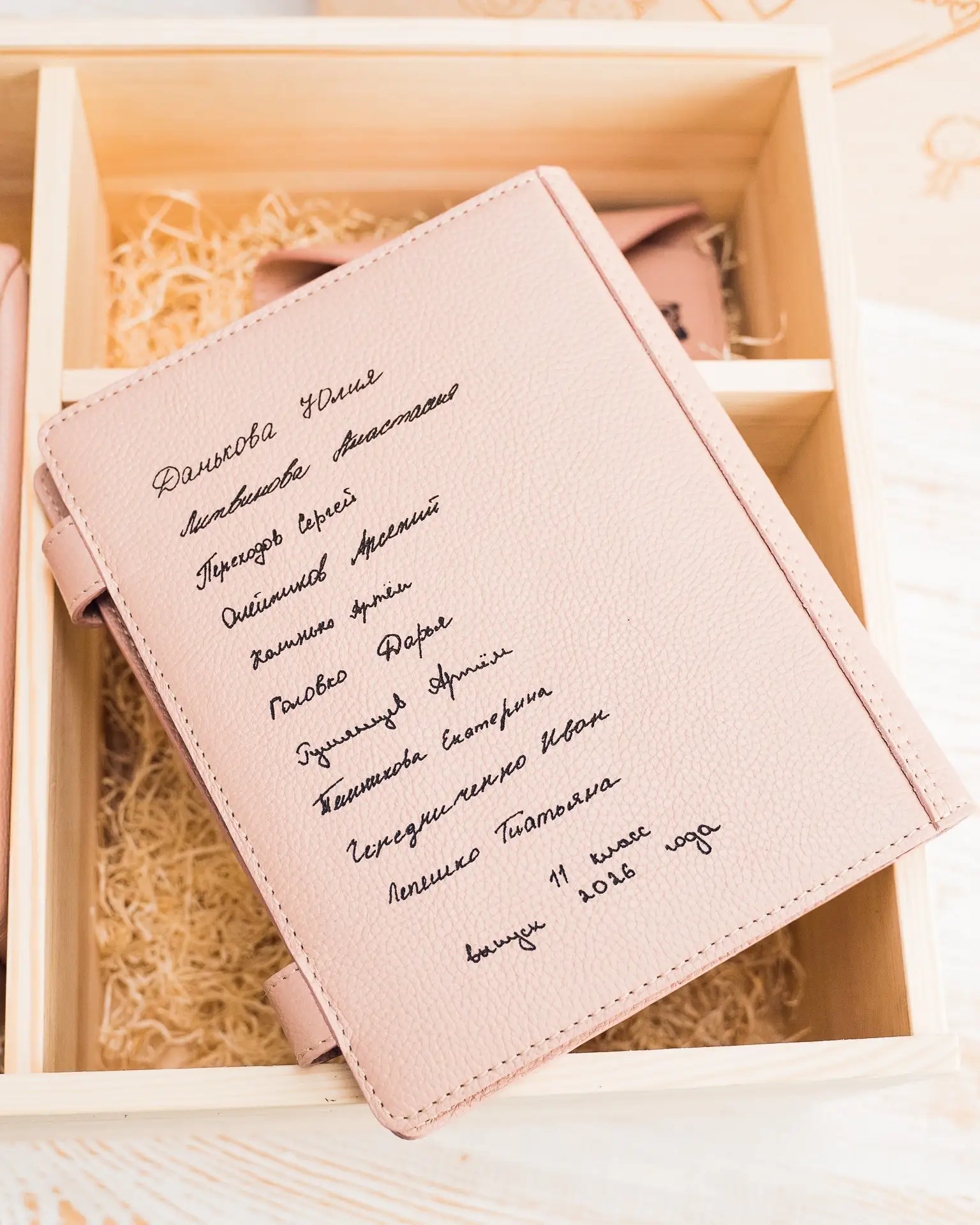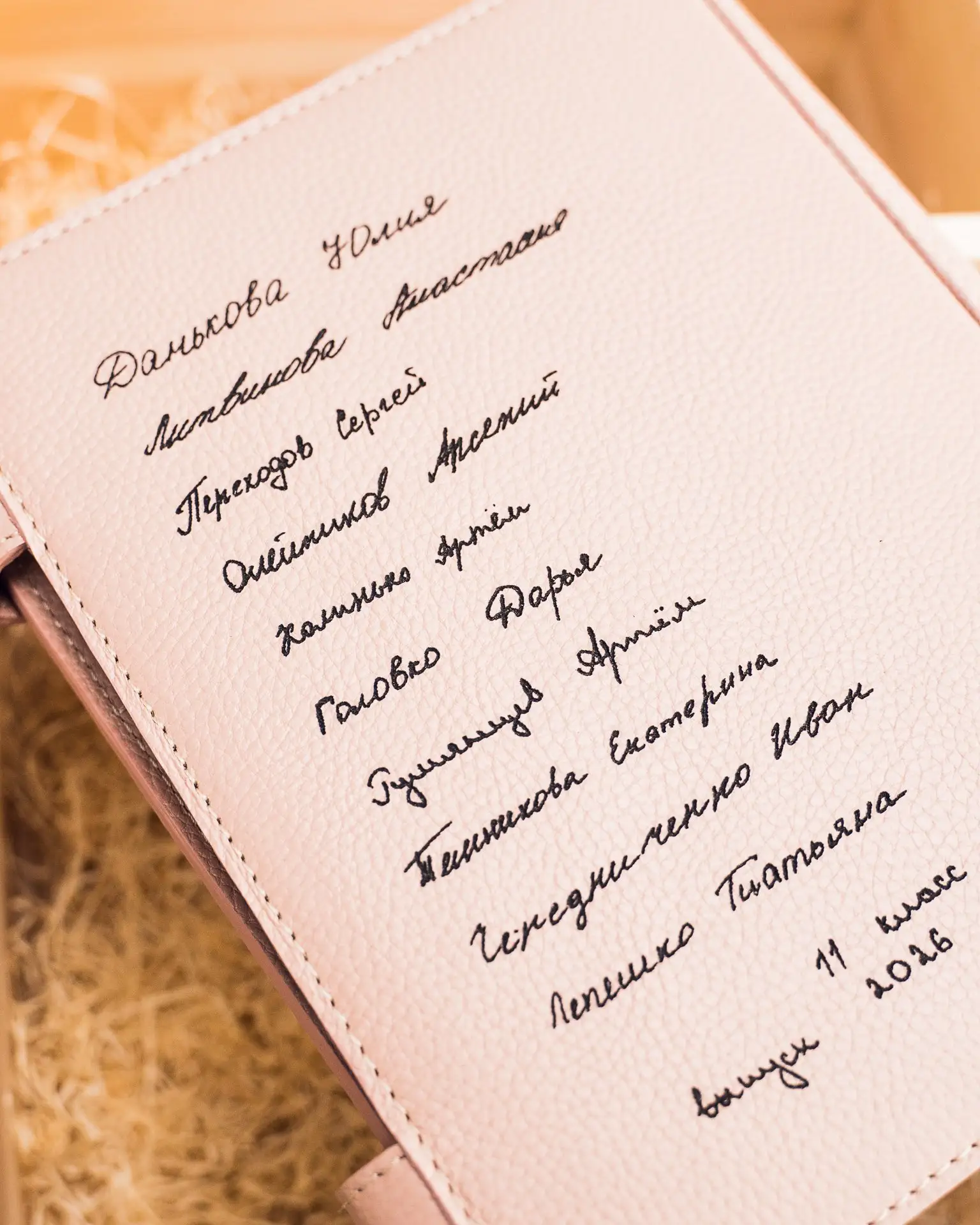 Очень популярный вариант подарка учителю - это блокнот с именами и фамилиями всех учеников класса. Вы присылаете мне фотографию листа, на котором расписались дети, а я в точности перенесу эти подписи на блокнот. Учитель знает почерк каждого ребёнка, поэтому такой подарок получается максимально личным.
