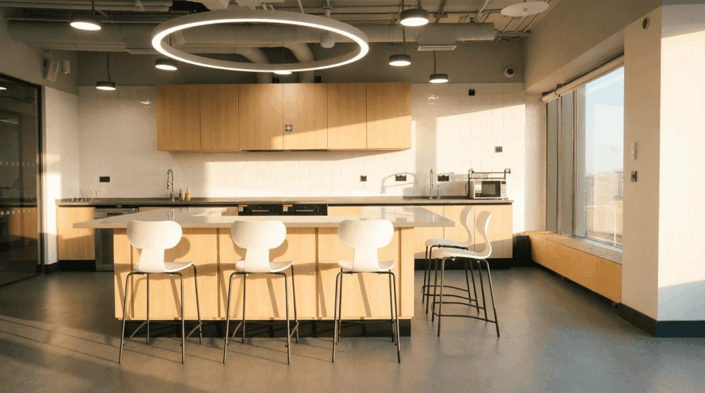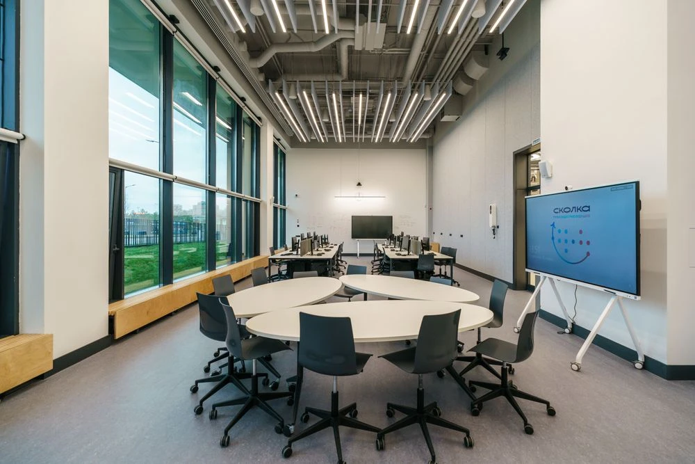 Архитектура школы создаёт открытые пространства для командной работы и мини-производств.