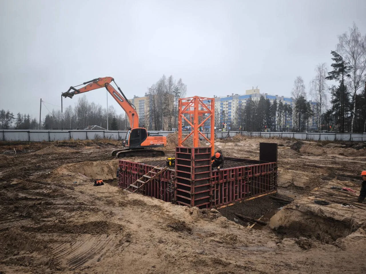 В настоящий момент завершены геодезические работы, начата разработка котлована и установлены фундаменты под башенные краны.