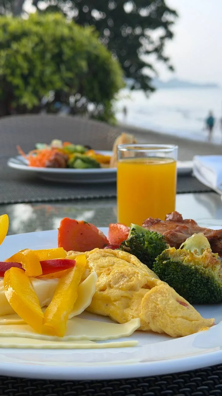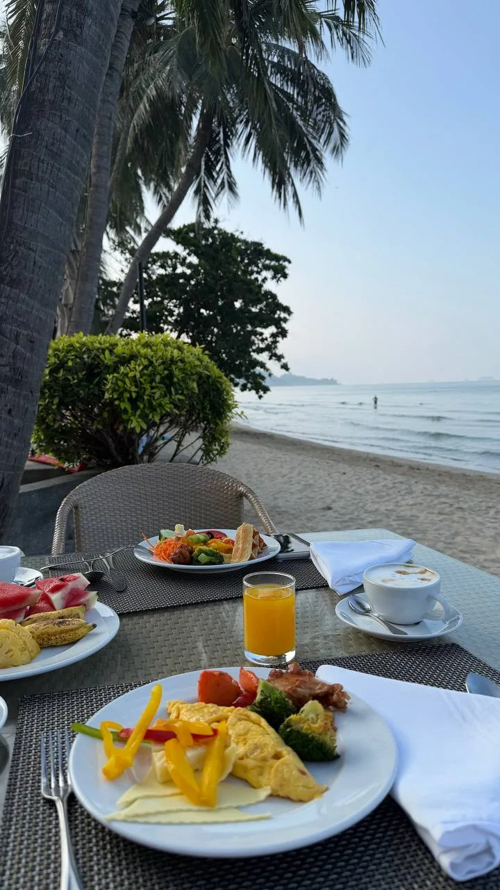 У нас включен завтрак - шведский стол, а обеды и ужины мы пробуем в разных кафешках. Завтраки стандартные, как обычно в Таиланде, выбор неплохой, так что голодным не останешься. А самая классная фишка - столики прямо на берегу моря!