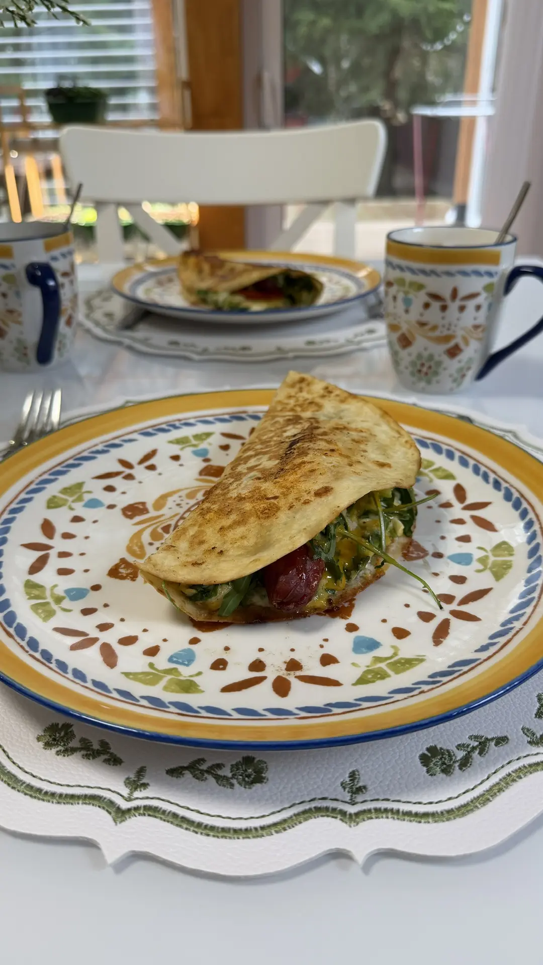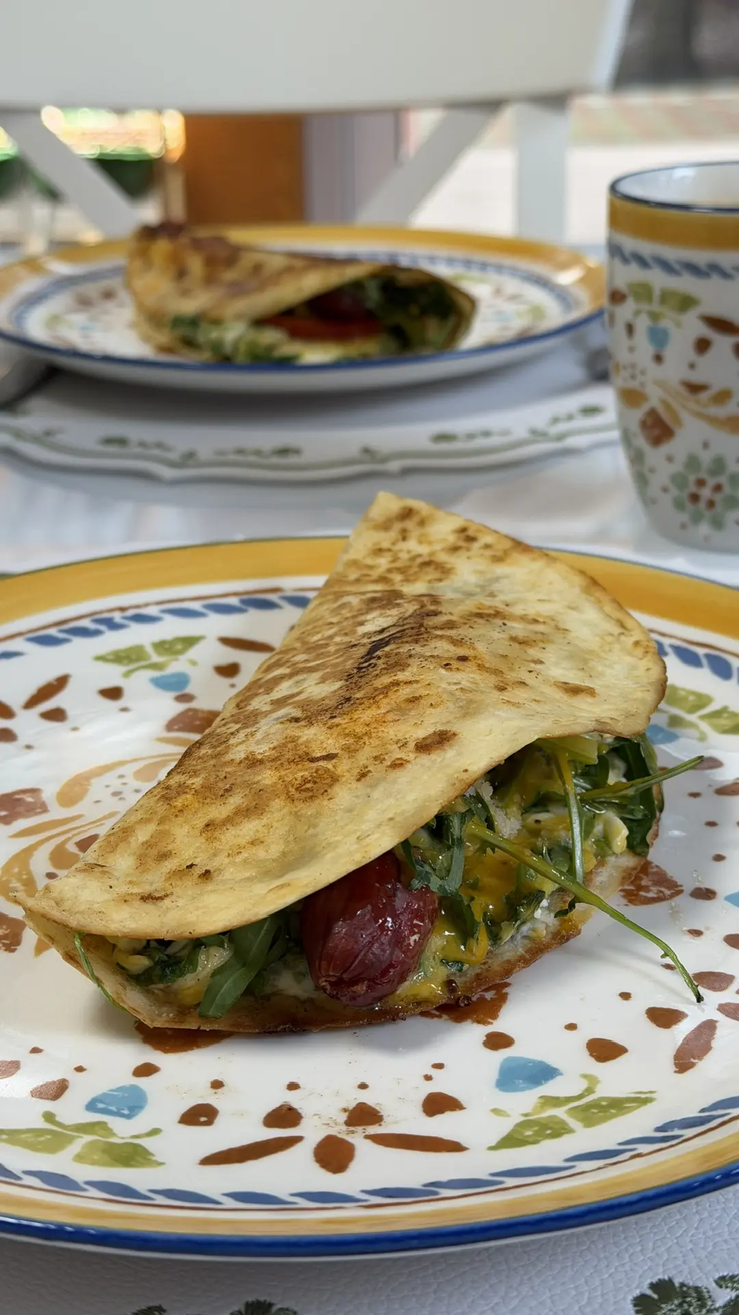 Пшеничная лепёшка с начинкой из омлета, колбаски, много зелени и соуса.