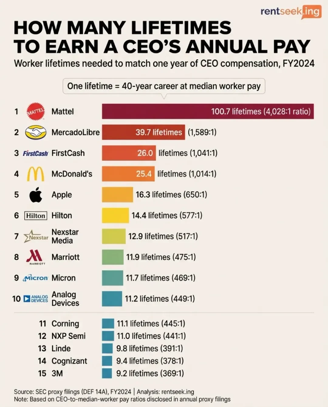 Сколько жизней понадобится среднему сотруднику, чтобы заработать годовую зарплату CEO своей компании.