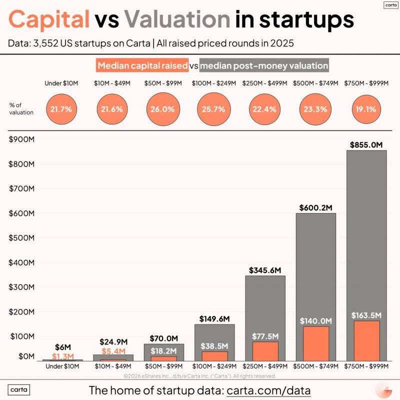 Доля привлечённого капитала относительно post-money оценки остаётся довольно ровной, примерно 22–28%.