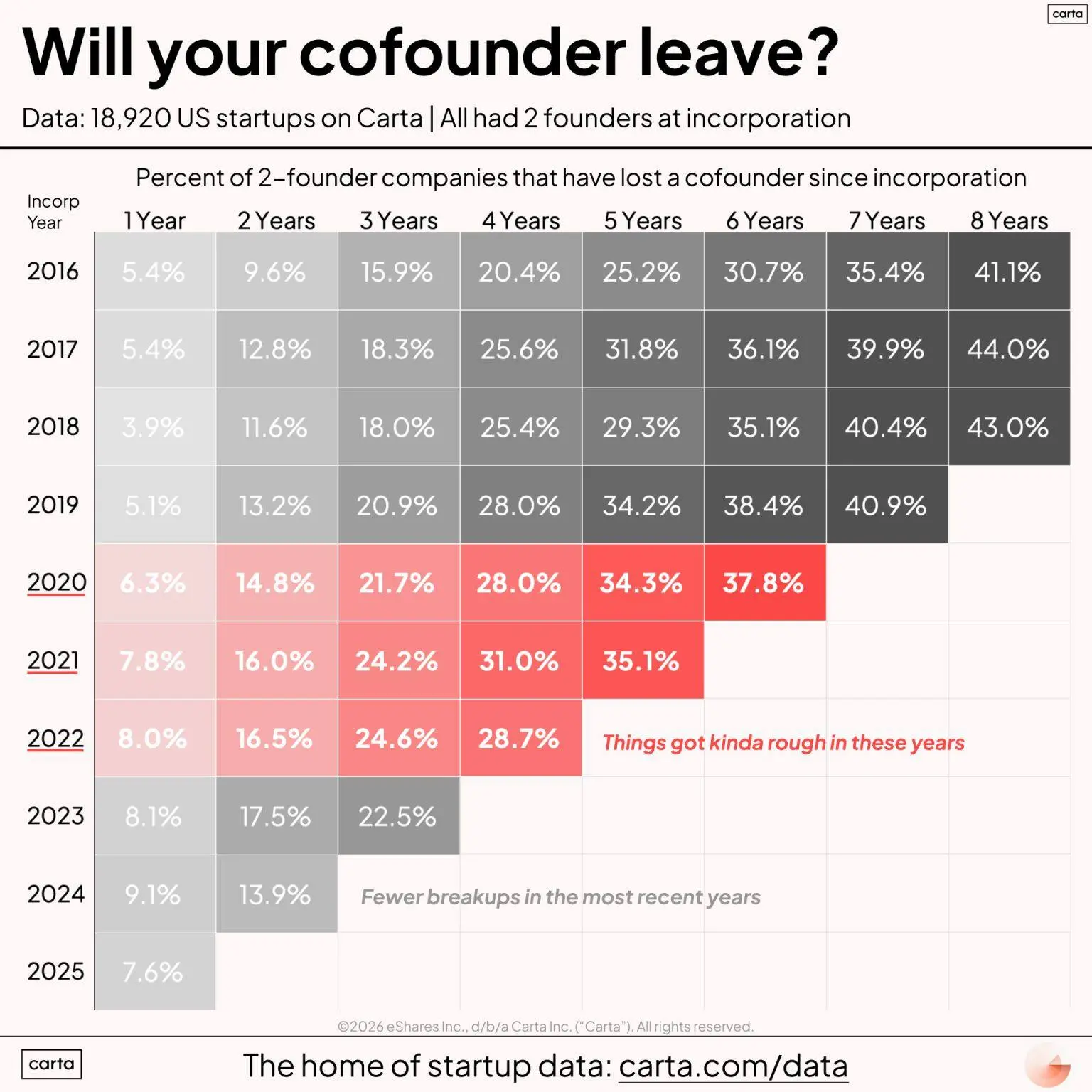 Carta посчитала по 18 920 стартапам с двумя фаундерами. К 5-му году ~30–35% компаний теряют одного из основателей. К 8-му — больше 40%.