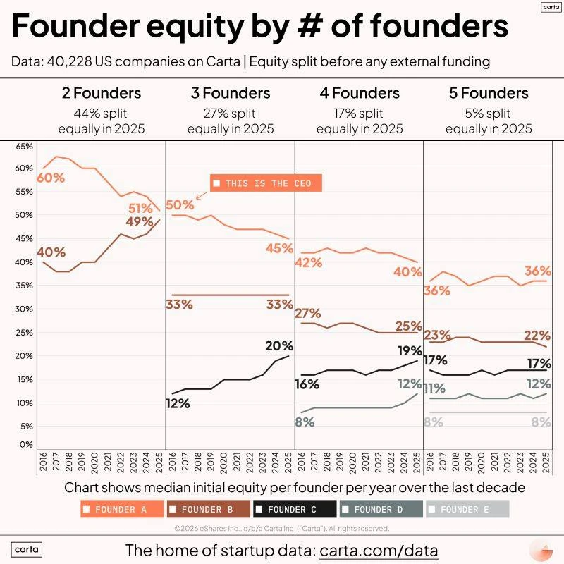 Статистика только по стартапам, которые пользуются Carta, Так что в реальном мире соло-фаундеров может быть еще больше.