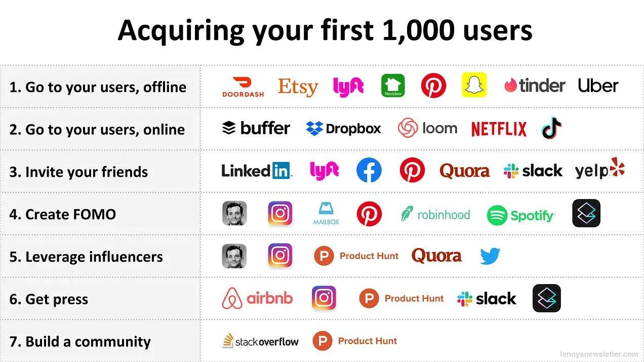 Ни одна из этих компаний не начинала с перформанс-маркетинга за миллионы. Первая тысяча пользователей — это всегда ручная работа.