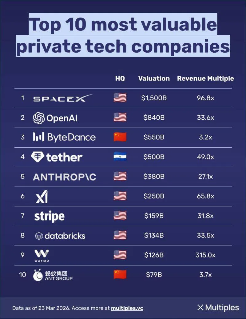 AI доминирует. OpenAI, Anthropic, xAI, Databricks — 4 из 10 компаний это чистый AI. Плюс ByteDance и Waymo тоже активно в теме.