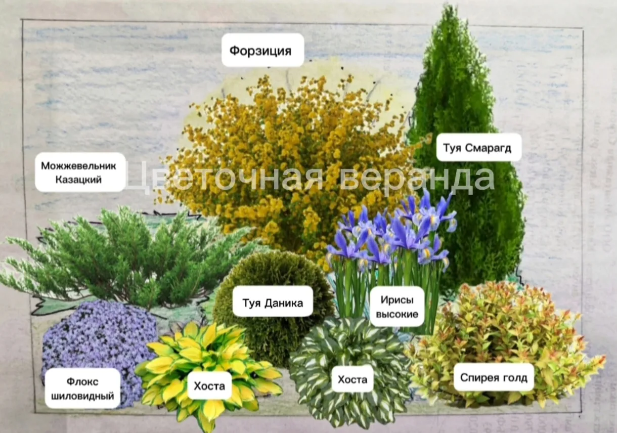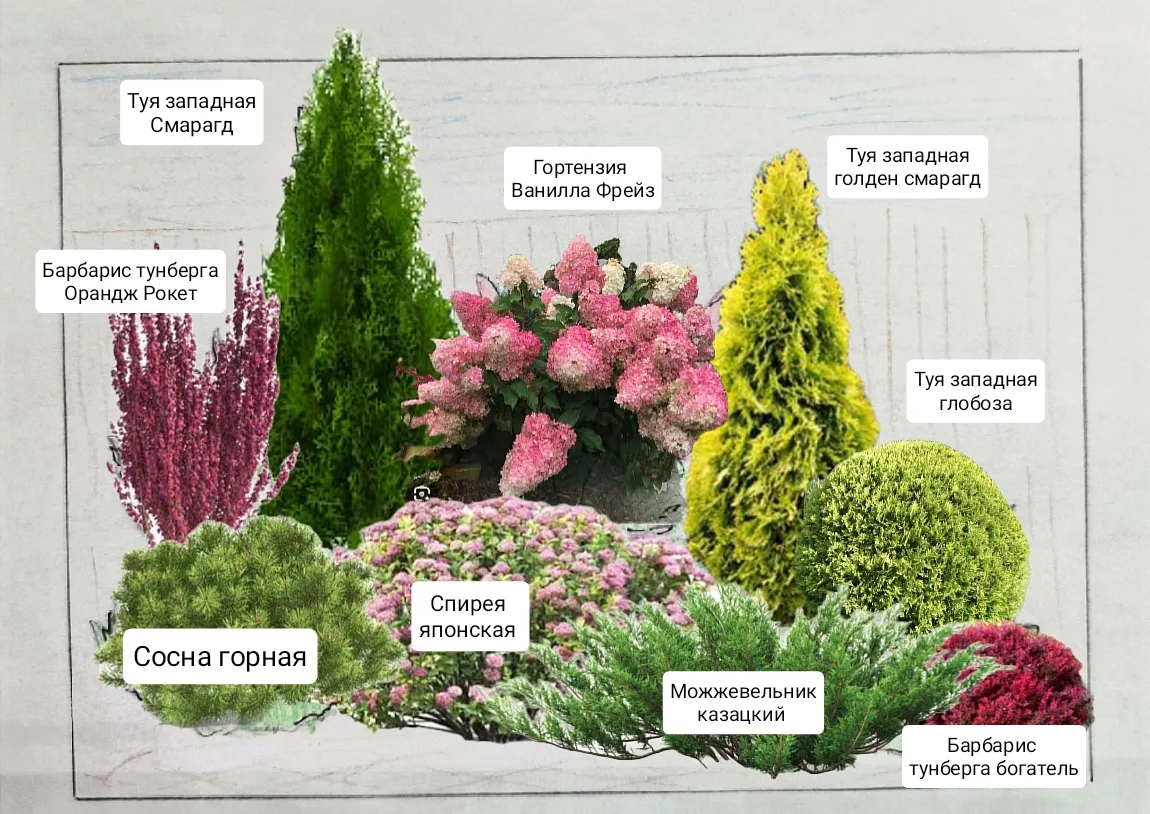Учла все Ваши пожелания - гортензия вместо форзиции, яркие акценты и никаких хост! 🫡