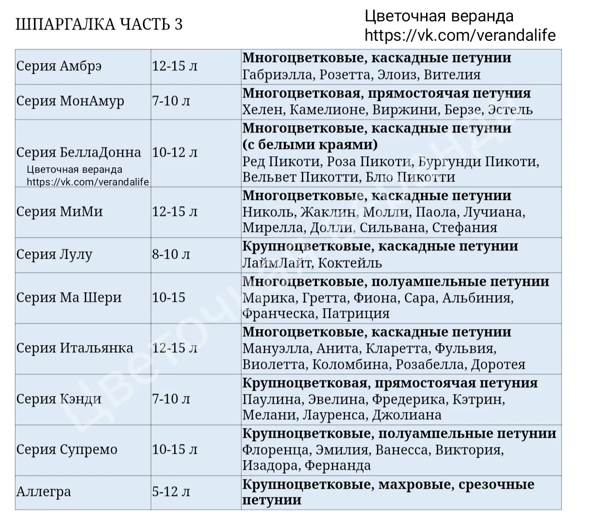 Завтра размещу шпаргалку по сортам петуний и объемам кашпо. Делала ее в прошлом году, очень удачная получилась.