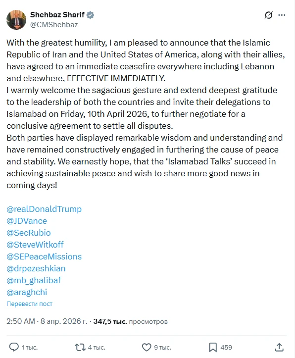 "Обе стороны проявили замечательную мудрость и взаимопонимание, продолжали конструктивно участвовать в деле достижения мира и стабильности. Мы искренне надеемся, что "Исламабадские переговоры" приведут к достижению устойчивого мира, и хотели бы поделиться новыми позитивными новостями в ближайшие дни!"