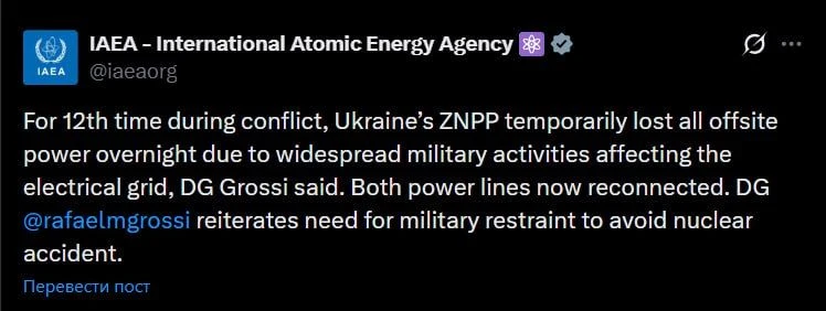 Электроснабжение ЗАЭС было прервано сегодня ночью в 12-й раз с начала конфликта. В настоящее время обе линии электропередачи восстановлены, сообщили в МАГАТЭ.