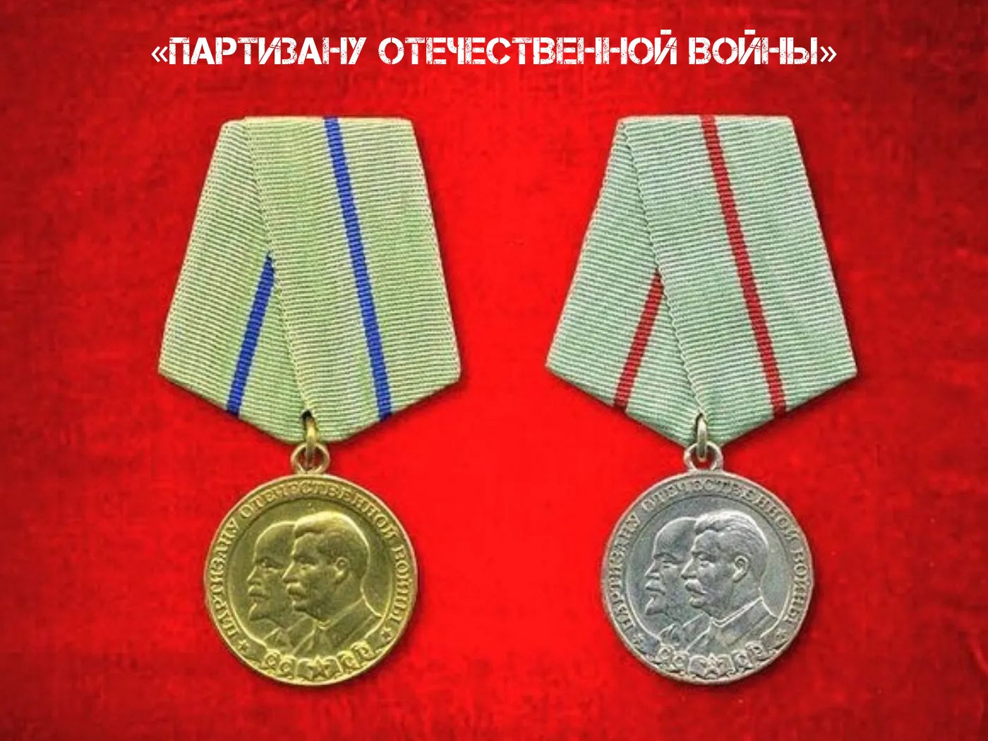 Медалью №1 в июне 1943 года был награждён советский партизан Ефим Осипенко, минёр, командир группы подрывников, осенью 1941 года ставший командиром мобильной группы партизанского отряда «Передовой», действовавшего в районе города Сухиничи Калужской области. В районе станции Мышбор, после отказа взрывателя самодельной мины, он взорвал заряд, ударив по детонатору шестом от железнодорожного знака.