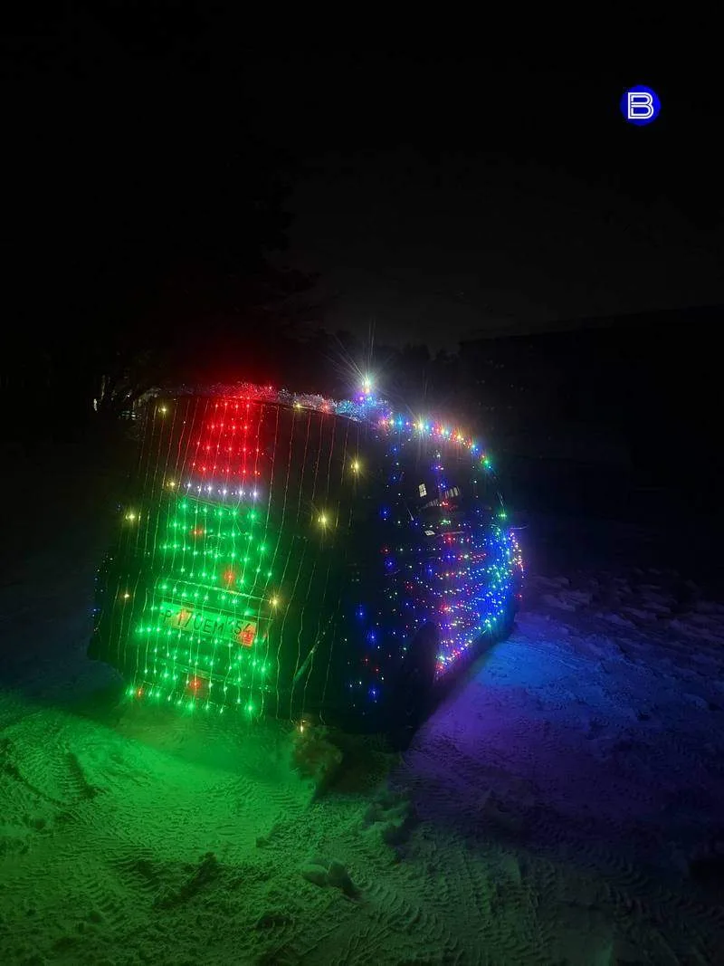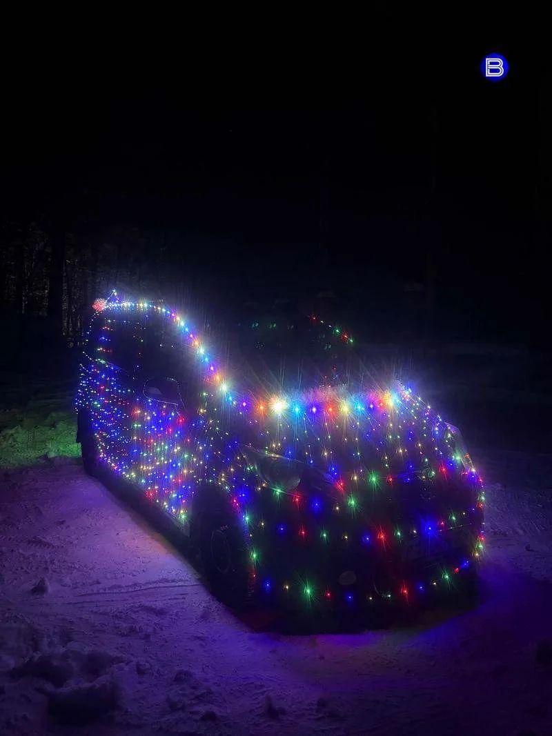 На авто — 90 метров гирлянд, которые могут показывать и ёлку, и российский триколор! Чтобы всё держалось, ушло ещё 13 метров скотча.